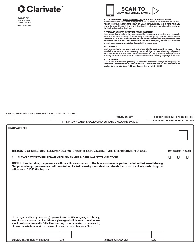 The undersigned hereby appoints Andrew Snyder, Jonathan Gear, Jonathan Collins and Jaspal Chahal, and each of them, each with the power of substitution and power to act alone, as proxies to vote all the ordinary shares that the undersigned would be entitled to vote if personally present and acting at the General Meeting of Shareholders of Clarivate PLC to be held on July 27, 2023 or at any postponement or adjournment thereof.