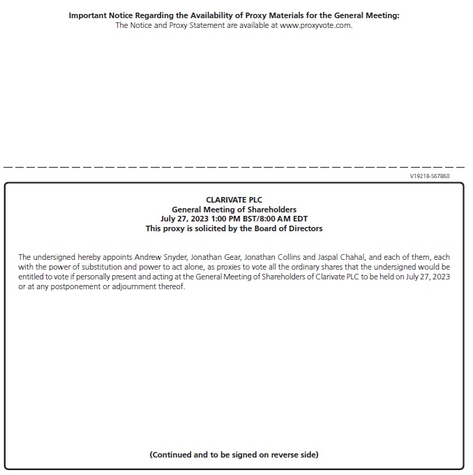 The undersigned hereby appoints Andrew Snyder, Jonathan Gear, Jonathan Collins and Jaspal Chahal, and each of them, each with the power of substitution and power to act alone, as proxies to vote all the ordinary shares that the undersigned would be entitled to vote if personally present and acting at the General Meeting of Shareholders of Clarivate PLC to be held on July 27, 2023 or at any postponement or adjournment thereof.