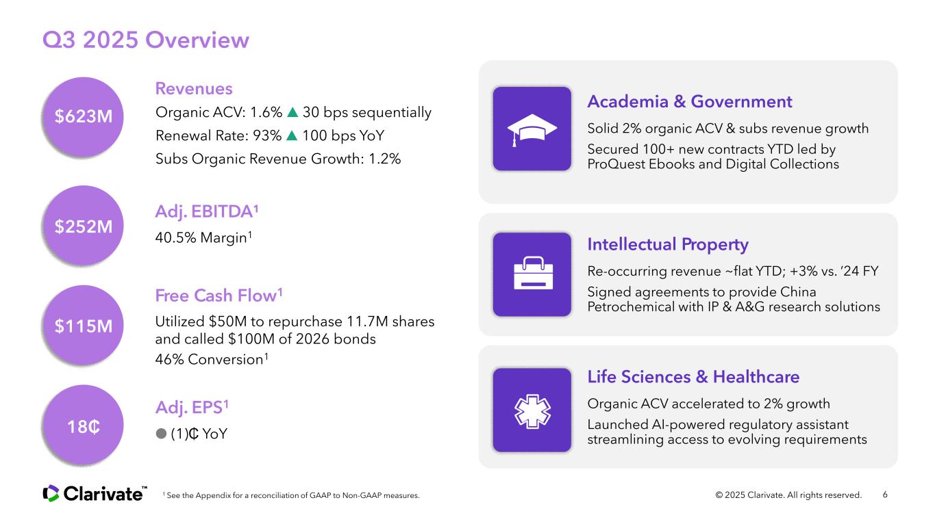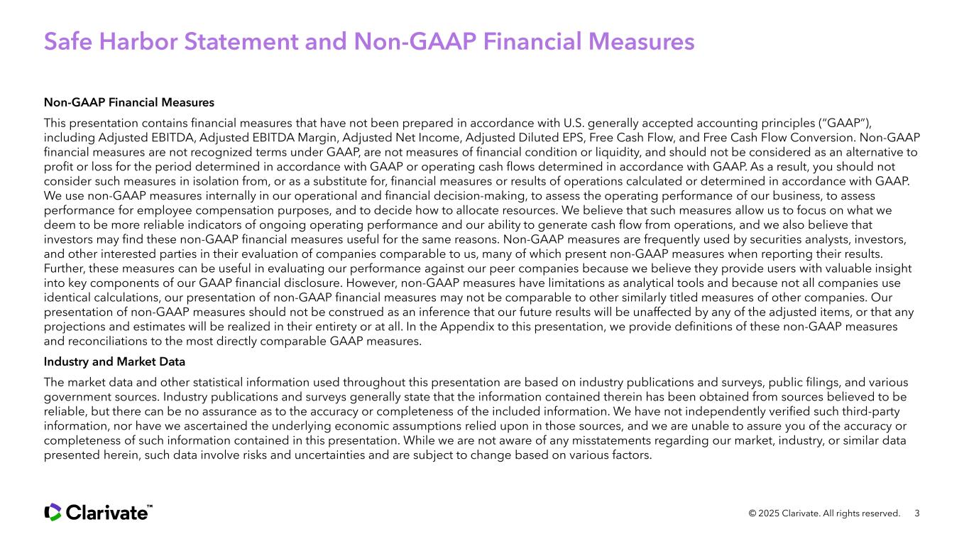 Safe Harbor Statement and Non-GAAP Financial Measures © 2025 Clarivate. All rights reserved. 2 Forward-Looking Statements This communication includes statements that express our opinions, expectations, beliefs, plans, objectives, assumptions, or projections regarding future events or future results and therefore are, or may be deemed to be, “forward-looking statements” within the meaning of the “safe harbor provisions” of the Private Securities Litigation Reform Act of 1995. These forward-looking statements can generally be identified by the use of forward-looking terminology, including the terms “believes,” “estimates,” “anticipates,” “expects,” “seeks,” “projects,” “intends,” “plans,” “may,” “will,” or “should” or, in each case, their negative or other variations or comparable terminology. These forward-looking statements include all matters that are not historical facts, and include statements regarding our intentions, beliefs, or current expectations concerning, among other things, anticipated cost savings, results of operations, financial condition, liquidity, prospects, growth, strategies, and the markets in which we operate. Such forward-looking statements are based on available current market material and management's expectations, beliefs, and forecasts concerning future events impacting us. There can be no assurance that future developments affecting us will be those that we have anticipated. These forward-looking statements involve a number of risks and uncertainties (some of which are beyond our control) or other assumptions that may cause actual results or performance to be materially different from those expressed or implied by these forward-looking statements. These risks and uncertainties include, but are not limited to, those factors described in Item 1A. Risk Factors of our annual report on Form 10-K, along with our other filings with the U.S. Securities and Exchange Commission ("SEC"). Should one or more of these risks or uncertainties materialize, or should any of the assumptions prove incorrect, actual results may vary in material respects from those projected in these forward-looking statements. We do not undertake any obligation to update or revise any forward-looking statements, whether as a result of new information, future events or otherwise, except as may be required under applicable securities laws. Please consult our public filings with the SEC, which are also available on our website at www.clarivate.com.