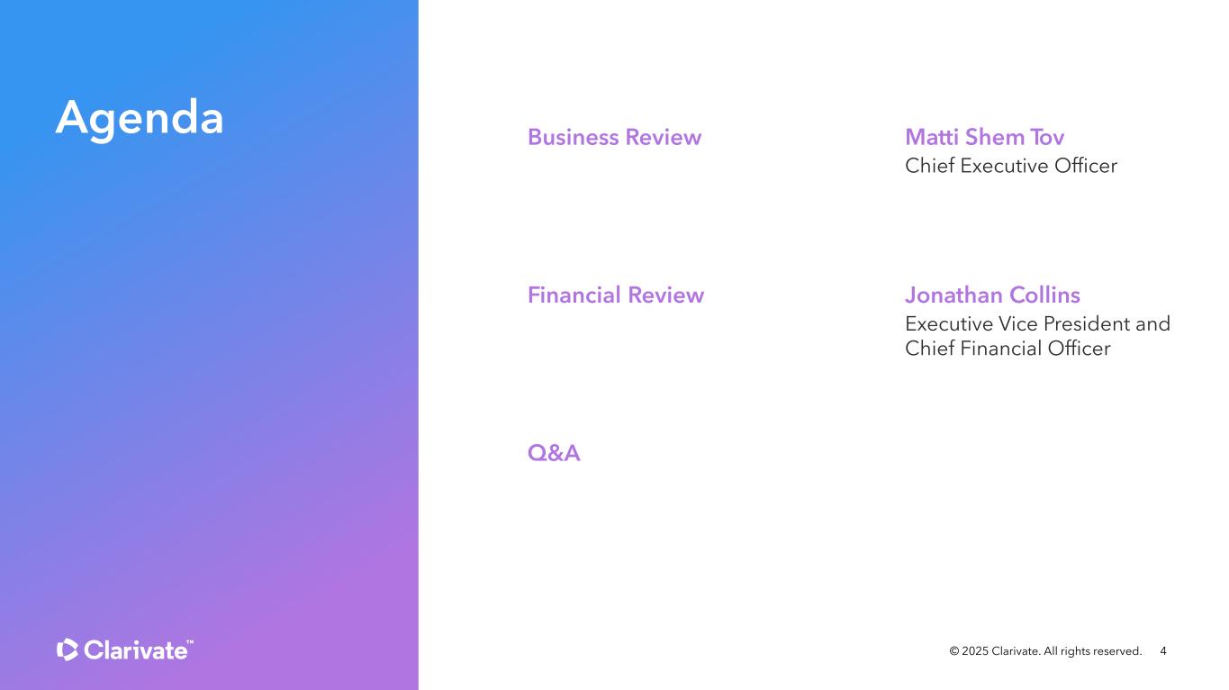 Safe Harbor Statement and Non-GAAP Financial Measures © 2025 Clarivate. All rights reserved. 3 Non-GAAP Financial Measures This presentation contains financial measures that have not been prepared in accordance with U.S. generally accepted accounting principles (“GAAP”), including Adjusted EBITDA, Adjusted EBITDA Margin, Adjusted Net Income, Adjusted Diluted EPS, Free Cash Flow, and Free Cash Flow Conversion. Non-GAAP financial measures are not recognized terms under GAAP, are not measures of financial condition or liquidity, and should not be considered as an alternative to profit or loss for the period determined in accordance with GAAP or operating cash flows determined in accordance with GAAP. As a result, you should not consider such measures in isolation from, or as a substitute for, financial measures or results of operations calculated or determined in accordance with GAAP. We use non-GAAP measures internally in our operational and financial decision-making, to assess the operating performance of our business, to assess performance for employee compensation purposes, and to decide how to allocate resources. We believe that such measures allow us to focus on what we deem to be more reliable indicators of ongoing operating performance and our ability to generate cash flow from operations, and we also believe that investors may find these non-GAAP financial measures useful for the same reasons. Non-GAAP measures are frequently used by securities analysts, investors, and other interested parties in their evaluation of companies comparable to us, many of which present non-GAAP measures when reporting their results. Further, these measures can be useful in evaluating our performance against our peer companies because we believe they provide users with valuable insight into key components of our GAAP financial disclosure. However, non-GAAP measures have limitations as analytical tools and because not all companies use identical calculations, our presentation of non-GAAP financial measures may not be comparable to other similarly titled measures of other companies. Our presentation of non-GAAP measures should not be construed as an inference that our future results will be unaffected by any of the adjusted items, or that any projections and estimates will be realized in their entirety or at all. In the Appendix to this presentation, we provide definitions of these non-GAAP measures and reconciliations to the most directly comparable GAAP measures. Industry and Market Data The market data and other statistical information used throughout this presentation are based on industry publications and surveys, public filings, and various government sources. Industry publications and surveys generally state that the information contained therein has been obtained from sources believed to be reliable, but there can be no assurance as to the accuracy or completeness of the included information. We have not independently verified such third-party information, nor have we ascertained the underlying economic assumptions relied upon in those sources, and we are unable to assure you of the accuracy or completeness of such information contained in this presentation. While we are not aware of any misstatements regarding our market, industry, or similar data presented herein, such data involve risks and uncertainties and are subject to change based on various factors.