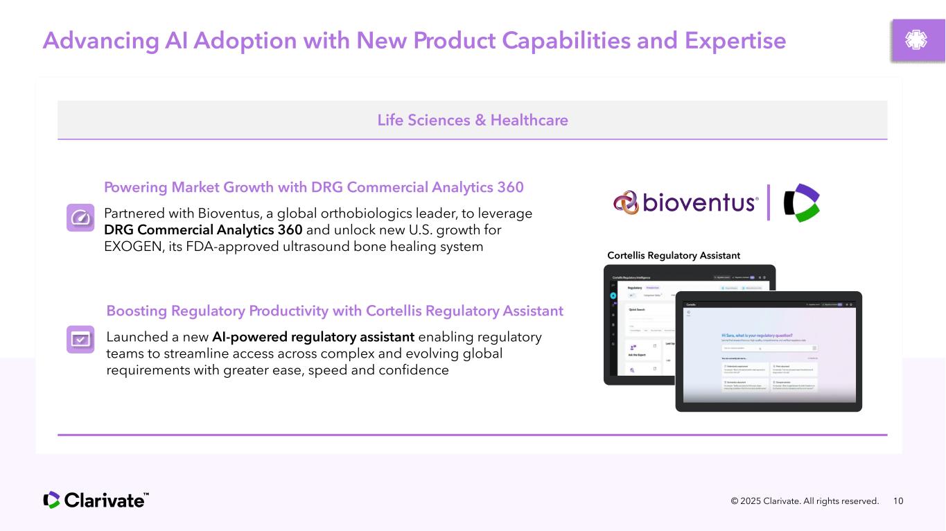 Advancing AI Adoption with New Product Capabilities and Expertise © 2025 Clarivate. All rights reserved. 10 Life Sciences & Healthcare Boosting Regulatory Productivity with Cortellis Regulatory Assistant Launched a new AI-powered regulatory assistant enabling regulatory teams to streamline access across complex and evolving global requirements with greater ease, speed and confidence Powering Market Growth with DRG Commercial Analytics 360 Partnered with Bioventus, a global orthobiologics leader, to leverage DRG Commercial Analytics 360 and unlock new U.S. growth for EXOGEN, its FDA-approved ultrasound bone healing system Cortellis Regulatory Assistant