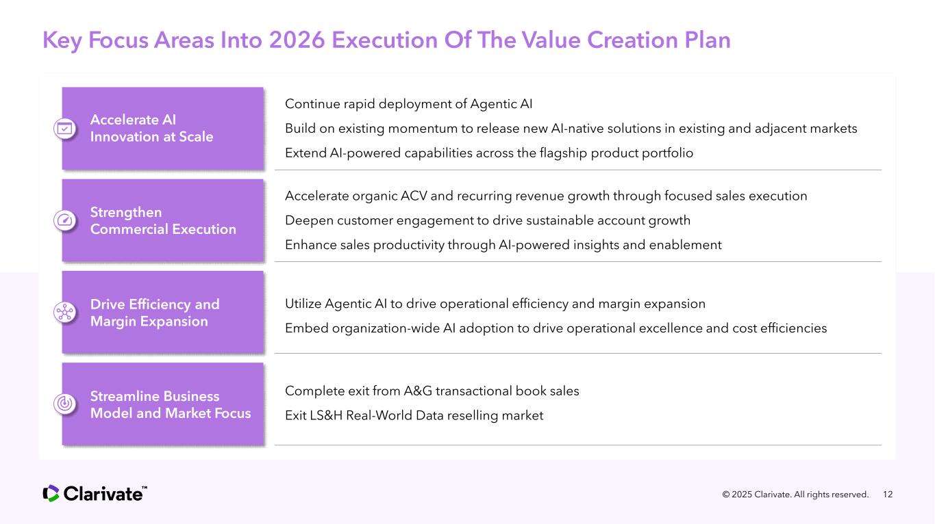 • A&G | General Release of Alma Specto (AI-native) • IP | Release Derwent Patent Monitor Solution • LS&H | Deploy Cortellis OFF-X AI Research Assistant • LS&H | Deploy Cortellis Drug Discovery Intelligence AI Research Assistant • A&G | Complete Digital Collections transition from transaction to subscription model Value Creation Plan on Track in 2025 © 2025 Clarivate. All rights reserved. 11 Q1 2025 Q3 2025Q2 2025 Q4 2025 Execute program to drive internal cost efficiencies Evaluate strategic alternatives Improved Sales Execution Business Model Optimization Accelerated Innovation Solutions Rationalization • A&G | Released Web of Science Research Intelligence AI agent to early adopters • IP | Released Derwent Suite Standard Essential Patent Analyzer (Innography) • LS&H | Released DRG MedTech Competitive Intelligence (subscription product) • LS&H | Deployed Cortellis Regulatory Intelligence AI Research Assistant • A&G | Launched ProQuest e-Books (subscription platform) • A&G | Launched ProQuest Digital Collections (subscription product) • LS&H | Launched DRG Fusion powered by RWD (subscription platform) • Implemented revised sales incentive models • Implemented initiative to grow and scale customer success teams for all segments • A&G | Released e-Book Central AI-powered research assistant • LS&H | Released enhanced AI-powered search functionality in Cortellis • IP | Released AI-powered Trade Mark opposition assistant ‘RiskMark’
