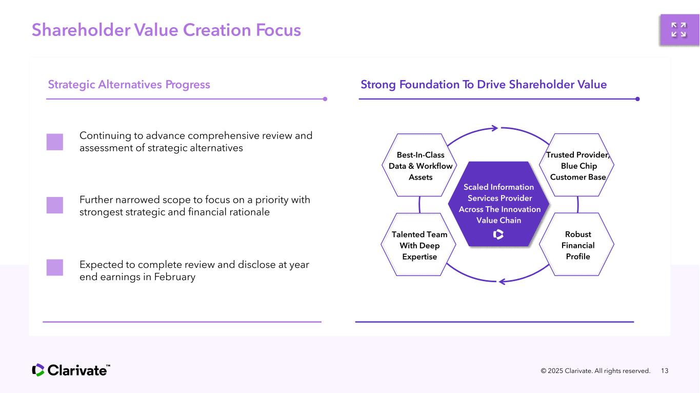 Shareholder Value Creation Focus © 2025 Clarivate. All rights reserved. 13 Continuing to advance comprehensive review and assessment of strategic alternatives Best-In-Class Data & Workflow Assets Products Colleagues Talented Team With Deep Expertise Trusted Provider, Blue Chip Customer Base Robust Financial Profile Scaled Information Services Provider Across The Innovation Value Chain Strategic Alternatives Progress Strong Foundation To Drive Shareholder Value Further narrowed scope to focus on a priority with strongest strategic and financial rationale Expected to complete review and disclose at year end earnings in February