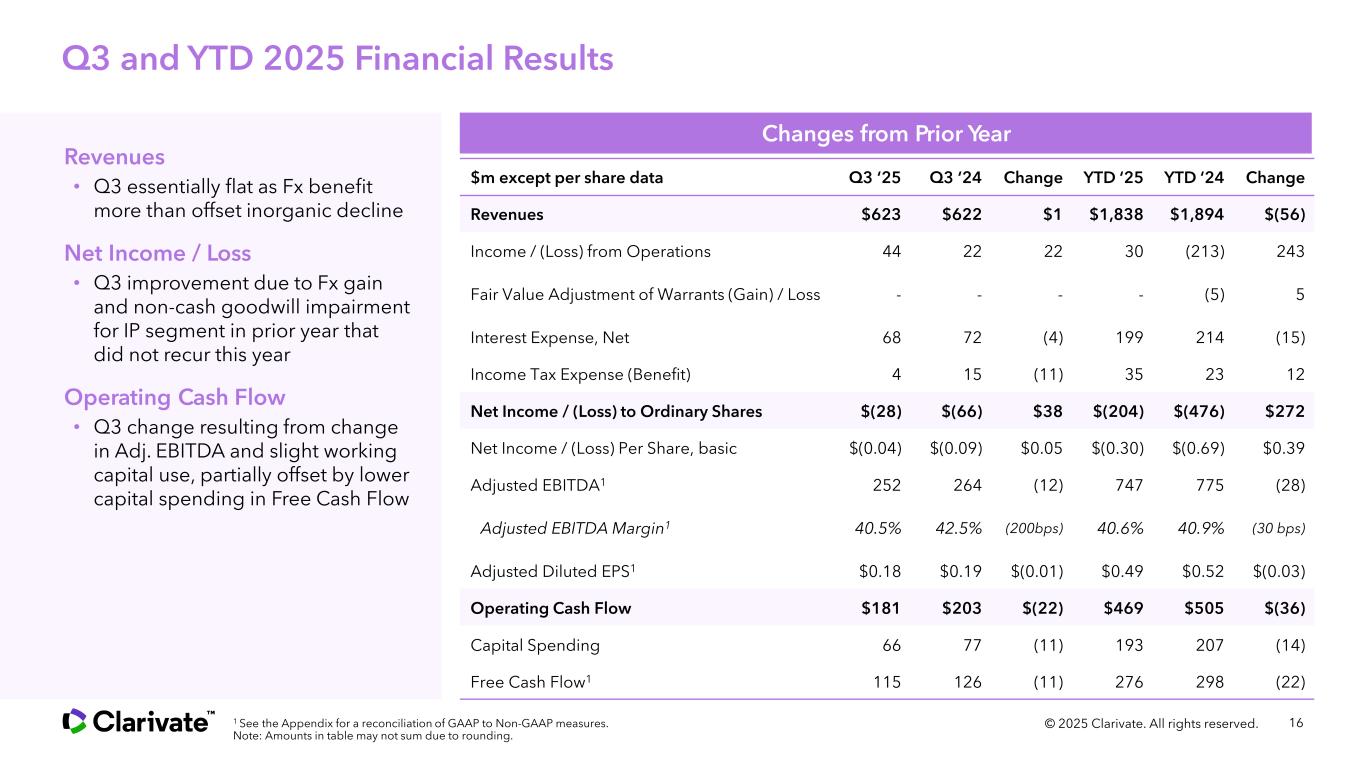 Q3 and YTD 2025 Financial Results 16 Changes from Prior Year 1 See the Appendix for a reconciliation of GAAP to Non-GAAP measures. Note: Amounts in table may not sum due to rounding. © 2025 Clarivate. All rights reserved. $m except per share data Q3 ‘25 Q3 ‘24 Change YTD ‘25 YTD ‘24 Change Revenues $623 $622 $1 $1,838 $1,894 $(56) Income / (Loss) from Operations 44 22 22 30 (213) 243 Fair Value Adjustment of Warrants (Gain) / Loss - - - - (5) 5 Interest Expense, Net 68 72 (4) 199 214 (15) Income Tax Expense (Benefit) 4 15 (11) 35 23 12 Net Income / (Loss) to Ordinary Shares $(28) $(66) $38 $(204) $(476) $272 Net Income / (Loss) Per Share, basic $(0.04) $(0.09) $0.05 $(0.30) $(0.69) $0.39 Adjusted EBITDA1 252 264 (12) 747 775 (28) Adjusted EBITDA Margin1 40.5% 42.5% (200bps) 40.6% 40.9% (30 bps) Adjusted Diluted EPS1 $0.18 $0.19 $(0.01) $0.49 $0.52 $(0.03) Operating Cash Flow $181 $203 $(22) $469 $505 $(36) Capital Spending 66 77 (11) 193 207 (14) Free Cash Flow1 115 126 (11) 276 298 (22) Revenues • Q3 essentially flat as Fx benefit more than offset inorganic decline Net Income / Loss • Q3 improvement due to Fx gain and non-cash goodwill impairment for IP segment in prior year that did not recur this year Operating Cash Flow • Q3 change resulting from change in Adj. EBITDA and slight working capital use, partially offset by lower capital spending in Free Cash Flow