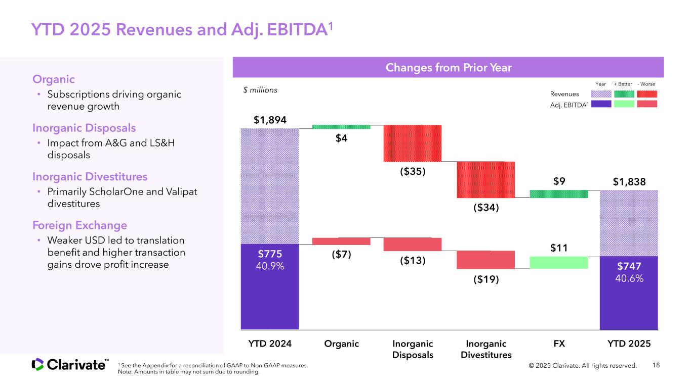 Changes from Prior Year Q3 2025 Revenues and Adj. EBITDA1 17© 2025 Clarivate. All rights reserved.1 See the Appendix for a reconciliation of GAAP to Non-GAAP measures. Note: Amounts in table may not sum due to rounding. Q3 2024 Q3 2025 $622 $623 $264 42.5% $252 40.5% Revenues Adj. EBITDA1 Year + Better - Worse $ millions FX $6 $6 Organic ($1) ($17) Inorganic Disposals $5 $4 Inorganic Divestitures ($9) ($5) Organic • Continued growth in subscription revenues offset by re-occurring and transactional headwinds; lower incentive compensation expense in prior year driving majority of profit headwind Inorganic Disposals • Decline in disposed businesses more than offset by multiple large books transactions that did not occur in the same period last year Inorganic Divestitures • ScholarOne divestiture Foreign Exchange • Weaker USD led to higher translation and transaction gains