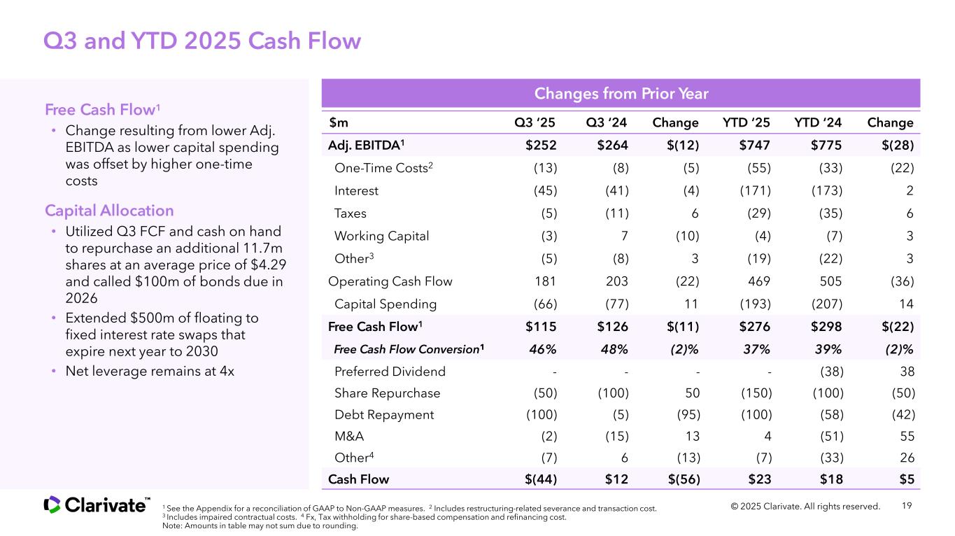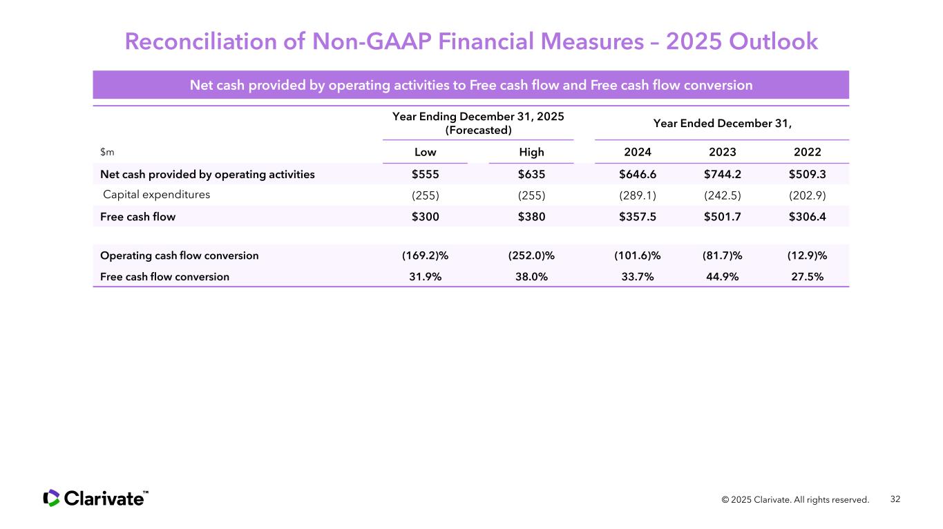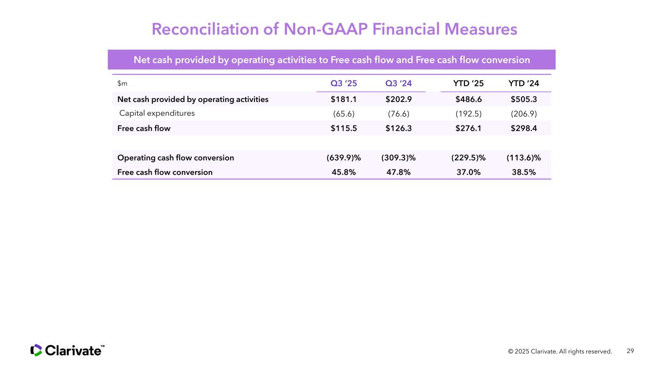 29© 2025 Clarivate. All rights reserved. $m Q3 ‘25 Q3 ‘24 YTD ’25 YTD ’24 Net cash provided by operating activities $181.1 $202.9 $486.6 $505.3 Capital expenditures (65.6) (76.6) (192.5) (206.9) Free cash flow $115.5 $126.3 $276.1 $298.4 Operating cash flow conversion (639.9)% (309.3)% (229.5)% (113.6)% Free cash flow conversion 45.8% 47.8% 37.0% 38.5% Reconciliation of Non-GAAP Financial Measures Net cash provided by operating activities to Free cash flow and Free cash flow conversion