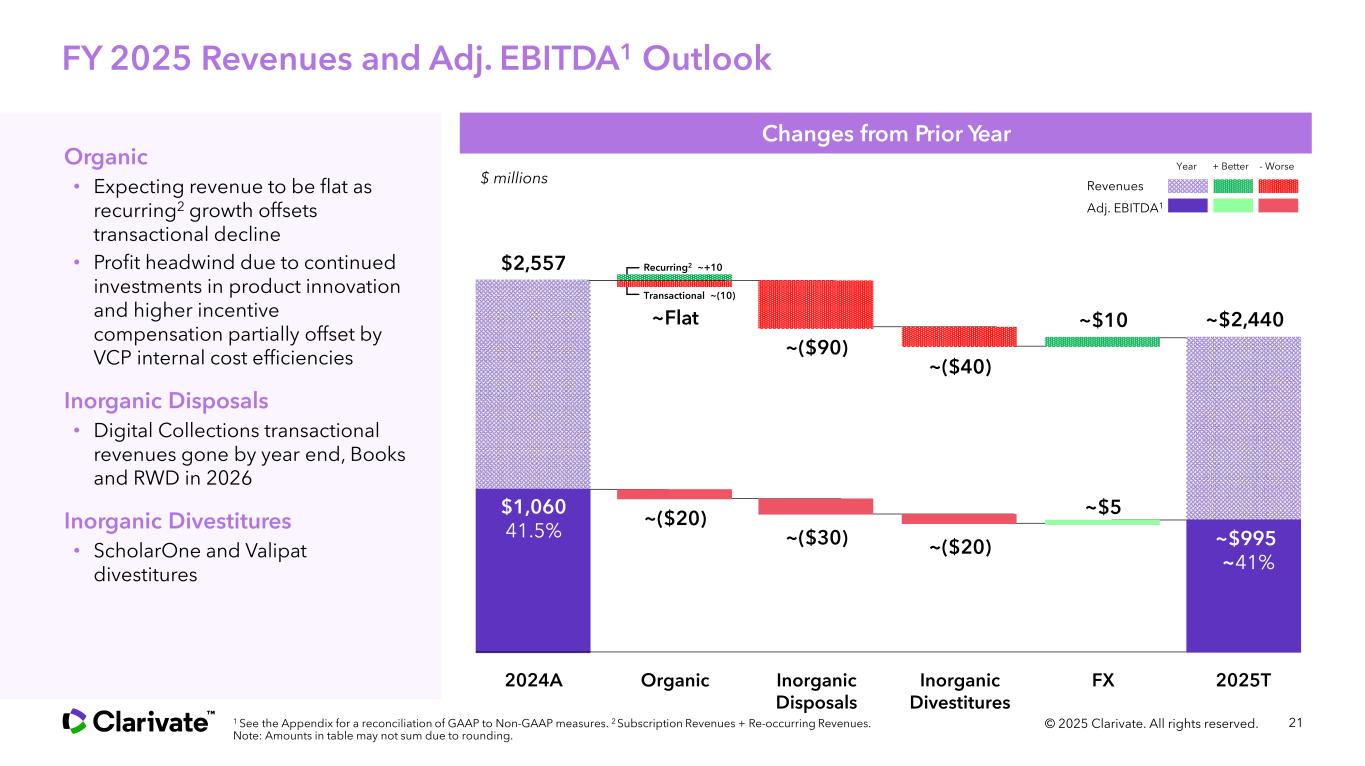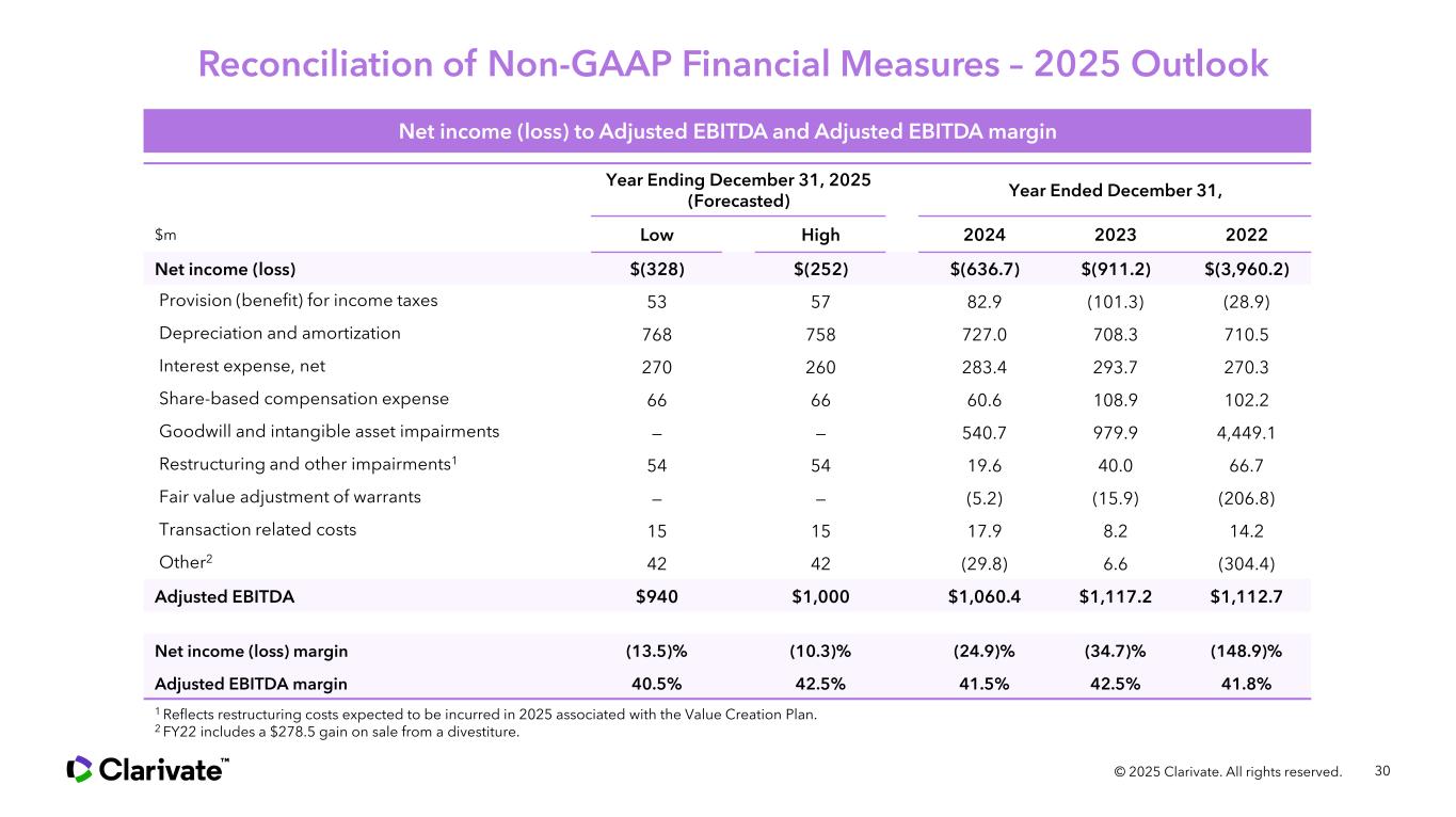 30© 2025 Clarivate. All rights reserved. Year Ending December 31, 2025 (Forecasted) Year Ended December 31, $m Low High 2024 2023 2022 Net income (loss) $(328) $(252) $(636.7) $(911.2) $(3,960.2) Provision (benefit) for income taxes 53 57 82.9 (101.3) (28.9) Depreciation and amortization 768 758 727.0 708.3 710.5 Interest expense, net 270 260 283.4 293.7 270.3 Share-based compensation expense 66 66 60.6 108.9 102.2 Goodwill and intangible asset impairments — — 540.7 979.9 4,449.1 Restructuring and other impairments1 54 54 19.6 40.0 66.7 Fair value adjustment of warrants — — (5.2) (15.9) (206.8) Transaction related costs 15 15 17.9 8.2 14.2 Other2 42 42 (29.8) 6.6 (304.4) Adjusted EBITDA $940 $1,000 $1,060.4 $1,117.2 $1,112.7 Net income (loss) margin (13.5)% (10.3)% (24.9)% (34.7)% (148.9)% Adjusted EBITDA margin 40.5% 42.5% 41.5% 42.5% 41.8% 1 Reflects restructuring costs expected to be incurred in 2025 associated with the Value Creation Plan. 2 FY22 includes a $278.5 gain on sale from a divestiture. Reconciliation of Non-GAAP Financial Measures – 2025 Outlook Net income (loss) to Adjusted EBITDA and Adjusted EBITDA margin