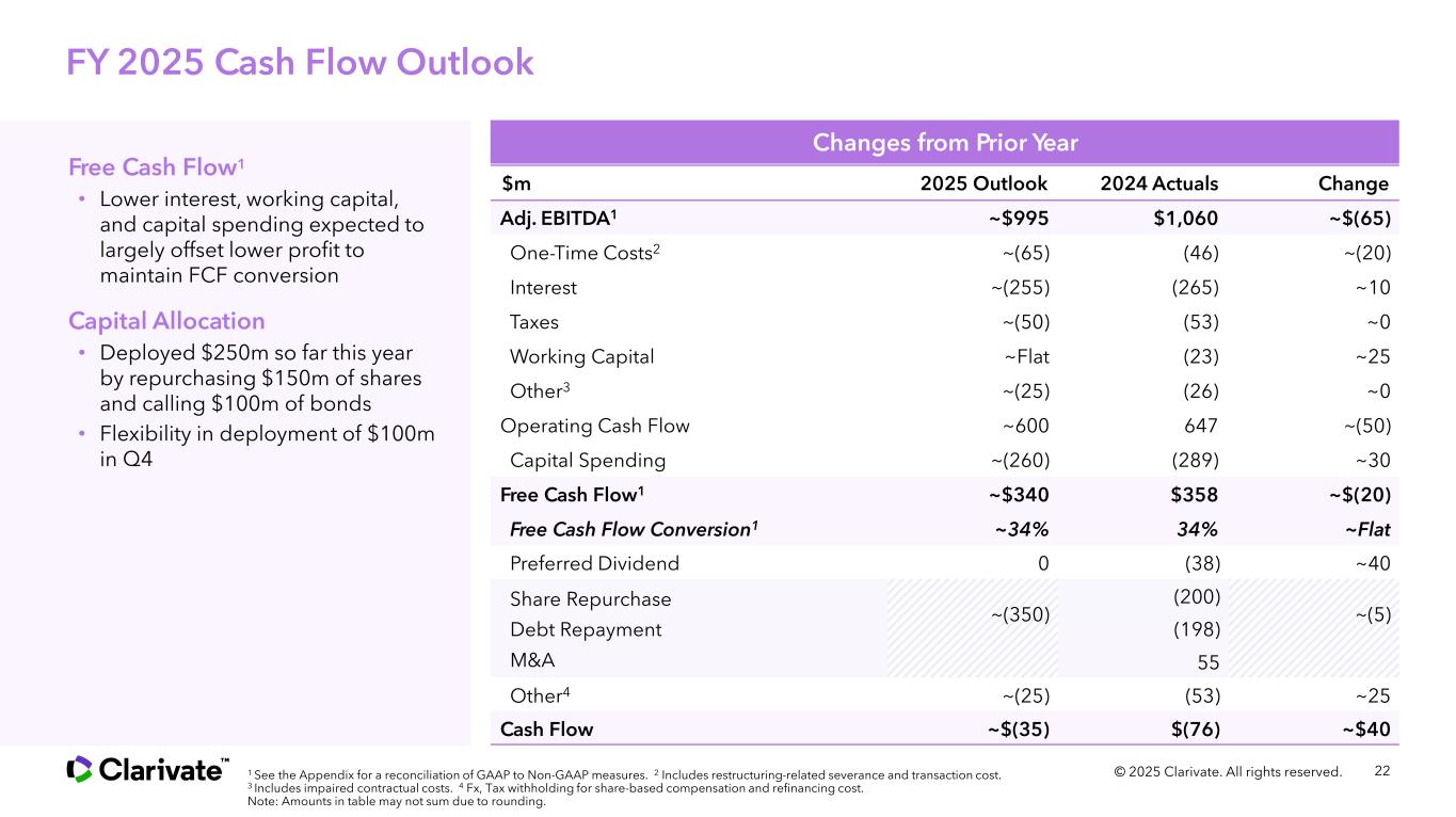 FY 2025 Cash Flow Outlook 22 $m 2025 Outlook 2024 Actuals Change Adj. EBITDA1 ~$995 $1,060 ~$(65) One-Time Costs2 ~(65) (46) ~(20) Interest ~(255) (265) ~10 Taxes ~(50) (53) ~0 Working Capital ~Flat (23) ~25 Other3 ~(25) (26) ~0 Operating Cash Flow ~600 647 ~(50) Capital Spending ~(260) (289) ~30 Free Cash Flow1 ~$340 $358 ~$(20) Free Cash Flow Conversion1 ~34% 34% ~Flat Preferred Dividend 0 (38) ~40 Share Repurchase ~(350) (200) ~(5) Debt Repayment (198) M&A 55 Other4 ~(25) (53) ~25 Cash Flow ~$(35) $(76) ~$40 © 2025 Clarivate. All rights reserved. Changes from Prior Year Free Cash Flow1 • Lower interest, working capital, and capital spending expected to largely offset lower profit to maintain FCF conversion Capital Allocation • Deployed $250m so far this year by repurchasing $150m of shares and calling $100m of bonds • Flexibility in deployment of $100m in Q4 1 See the Appendix for a reconciliation of GAAP to Non-GAAP measures. 2 Includes restructuring-related severance and transaction cost. 3 Includes impaired contractual costs. 4 Fx, Tax withholding for share-based compensation and refinancing cost. Note: Amounts in table may not sum due to rounding.