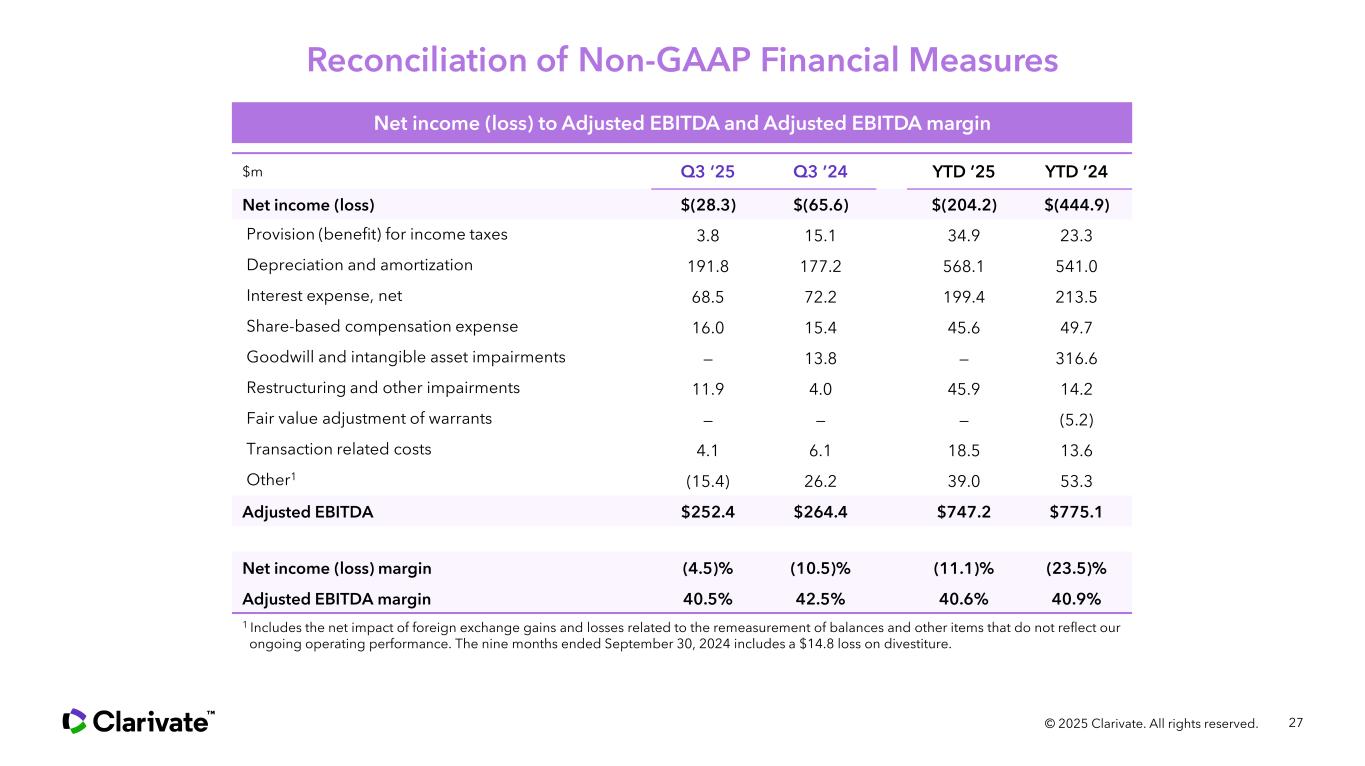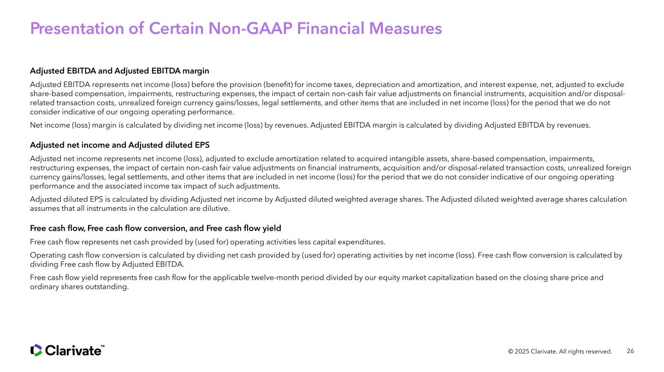 26© 2025 Clarivate. All rights reserved. Presentation of Certain Non-GAAP Financial Measures Adjusted EBITDA and Adjusted EBITDA margin Adjusted EBITDA represents net income (loss) before the provision (benefit) for income taxes, depreciation and amortization, and interest expense, net, adjusted to exclude share-based compensation, impairments, restructuring expenses, the impact of certain non-cash fair value adjustments on financial instruments, acquisition and/or disposal- related transaction costs, unrealized foreign currency gains/losses, legal settlements, and other items that are included in net income (loss) for the period that we do not consider indicative of our ongoing operating performance. Net income (loss) margin is calculated by dividing net income (loss) by revenues. Adjusted EBITDA margin is calculated by dividing Adjusted EBITDA by revenues. Adjusted net income and Adjusted diluted EPS Adjusted net income represents net income (loss), adjusted to exclude amortization related to acquired intangible assets, share-based compensation, impairments, restructuring expenses, the impact of certain non-cash fair value adjustments on financial instruments, acquisition and/or disposal-related transaction costs, unrealized foreign currency gains/losses, legal settlements, and other items that are included in net income (loss) for the period that we do not consider indicative of our ongoing operating performance and the associated income tax impact of such adjustments. Adjusted diluted EPS is calculated by dividing Adjusted net income by Adjusted diluted weighted average shares. The Adjusted diluted weighted average shares calculation assumes that all instruments in the calculation are dilutive. Free cash flow, Free cash flow conversion, and Free cash flow yield Free cash flow represents net cash provided by (used for) operating activities less capital expenditures. Operating cash flow conversion is calculated by dividing net cash provided by (used for) operating activities by net income (loss). Free cash flow conversion is calculated by dividing Free cash flow by Adjusted EBITDA. Free cash flow yield represents free cash flow for the applicable twelve-month period divided by our equity market capitalization based on the closing share price and ordinary shares outstanding.