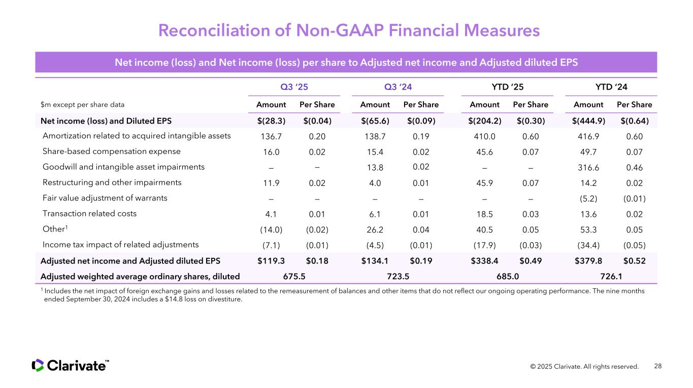 27 $m Q3 ‘25 Q3 ’24 YTD ’25 YTD ’24 Net income (loss) $(28.3) $(65.6) $(204.2) $(444.9) Provision (benefit) for income taxes 3.8 15.1 34.9 23.3 Depreciation and amortization 191.8 177.2 568.1 541.0 Interest expense, net 68.5 72.2 199.4 213.5 Share-based compensation expense 16.0 15.4 45.6 49.7 Goodwill and intangible asset impairments — 13.8 — 316.6 Restructuring and other impairments 11.9 4.0 45.9 14.2 Fair value adjustment of warrants — — — (5.2) Transaction related costs 4.1 6.1 18.5 13.6 Other1 (15.4) 26.2 39.0 53.3 Adjusted EBITDA $252.4 $264.4 $747.2 $775.1 Net income (loss) margin (4.5)% (10.5)% (11.1)% (23.5)% Adjusted EBITDA margin 40.5% 42.5% 40.6% 40.9% © 2025 Clarivate. All rights reserved. 1 Includes the net impact of foreign exchange gains and losses related to the remeasurement of balances and other items that do not reflect our ongoing operating performance. The nine months ended September 30, 2024 includes a $14.8 loss on divestiture. Reconciliation of Non-GAAP Financial Measures Net income (loss) to Adjusted EBITDA and Adjusted EBITDA margin