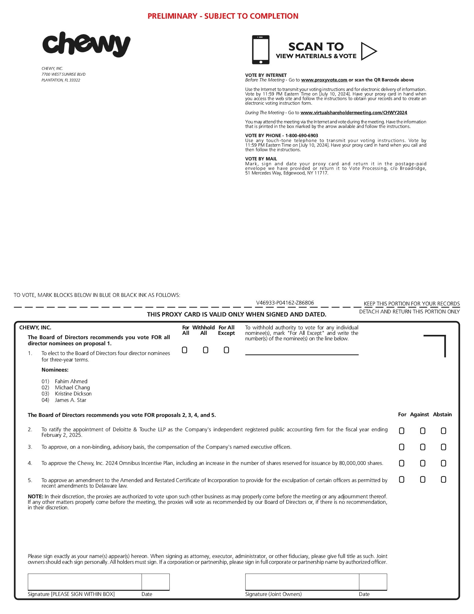 • | Proposal 4: To approve the Chewy, Inc. 2024 Omnibus Incentive Plan (the “2024 Plan”), including an increase in the number of shares reserved for issuance by 80,000,000 shares; and |