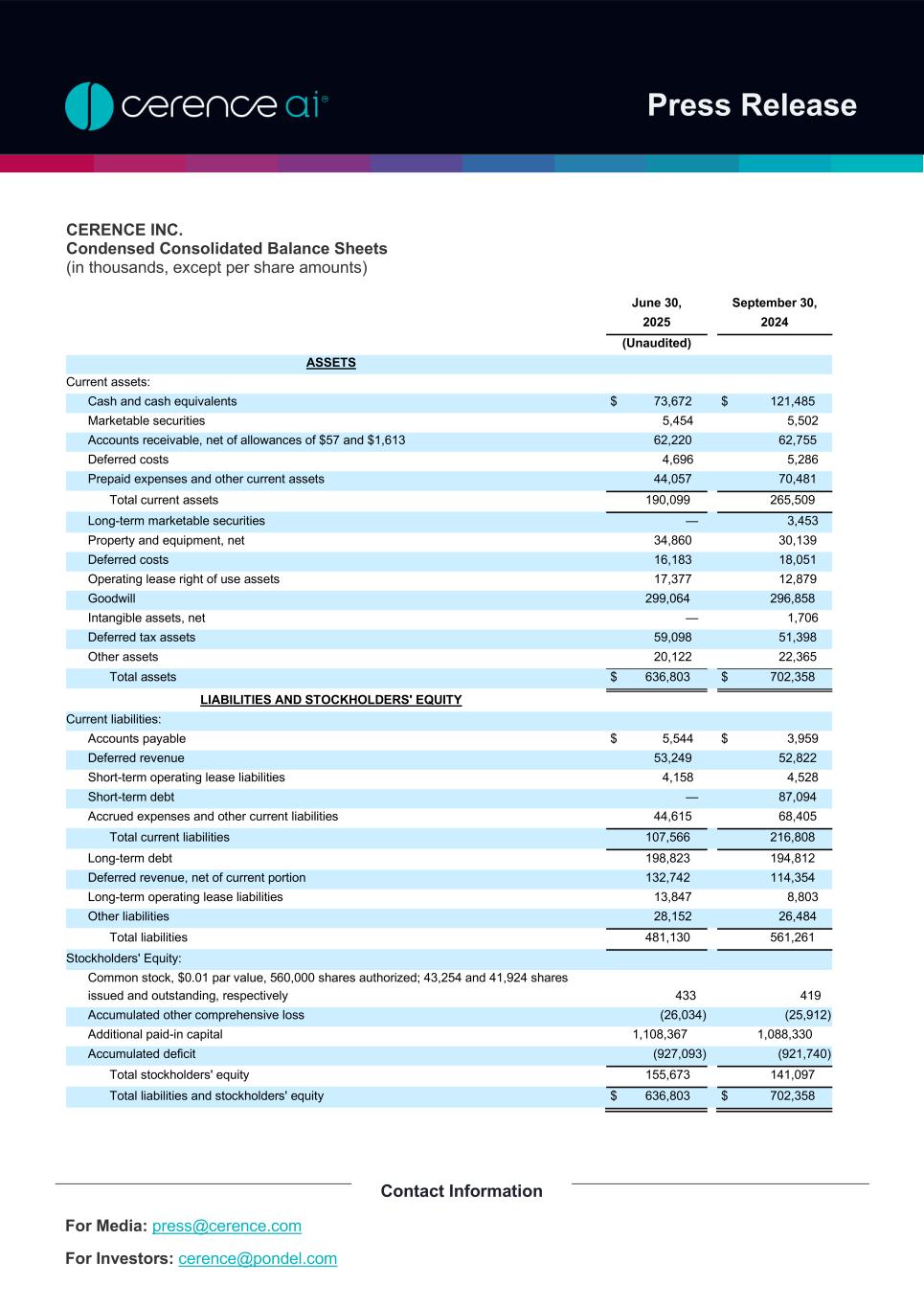 Press Release Contact Information For Media: press@cerence.com For Investors: cerence@pondel.com CERENCE INC. Condensed Consolidated Balance Sheets (in thousands, except per share amounts) June 30, September 30, 2025 2024 (Unaudited) ASSETS Current assets: Cash and cash equivalents $ 73,672 $ 121,485 Marketable securities 5,454 5,502 Accounts receivable, net of allowances of $57 and $1,613 62,220 62,755 Deferred costs 4,696 5,286 Prepaid expenses and other current assets 44,057 70,481 Total current assets 190,099 265,509 Long-term marketable securities — 3,453 Property and equipment, net 34,860 30,139 Deferred costs 16,183 18,051 Operating lease right of use assets 17,377 12,879 Goodwill 299,064 296,858 Intangible assets, net — 1,706 Deferred tax assets 59,098 51,398 Other assets 20,122 22,365 Total assets $ 636,803 $ 702,358 LIABILITIES AND STOCKHOLDERS' EQUITY Current liabilities: Accounts payable $ 5,544 $ 3,959 Deferred revenue 53,249 52,822 Short-term operating lease liabilities 4,158 4,528 Short-term debt — 87,094 Accrued expenses and other current liabilities 44,615 68,405 Total current liabilities 107,566 216,808 Long-term debt 198,823 194,812 Deferred revenue, net of current portion 132,742 114,354 Long-term operating lease liabilities 13,847 8,803 Other liabilities 28,152 26,484 Total liabilities 481,130 561,261 Stockholders' Equity: Common stock, $0.01 par value, 560,000 shares authorized; 43,254 and 41,924 shares issued and outstanding, respectively 433 419 Accumulated other comprehensive loss (26,034) (25,912) Additional paid-in capital 1,108,367 1,088,330 Accumulated deficit (927,093) (921,740) Total stockholders' equity 155,673 141,097 Total liabilities and stockholders' equity $ 636,803 $ 702,358