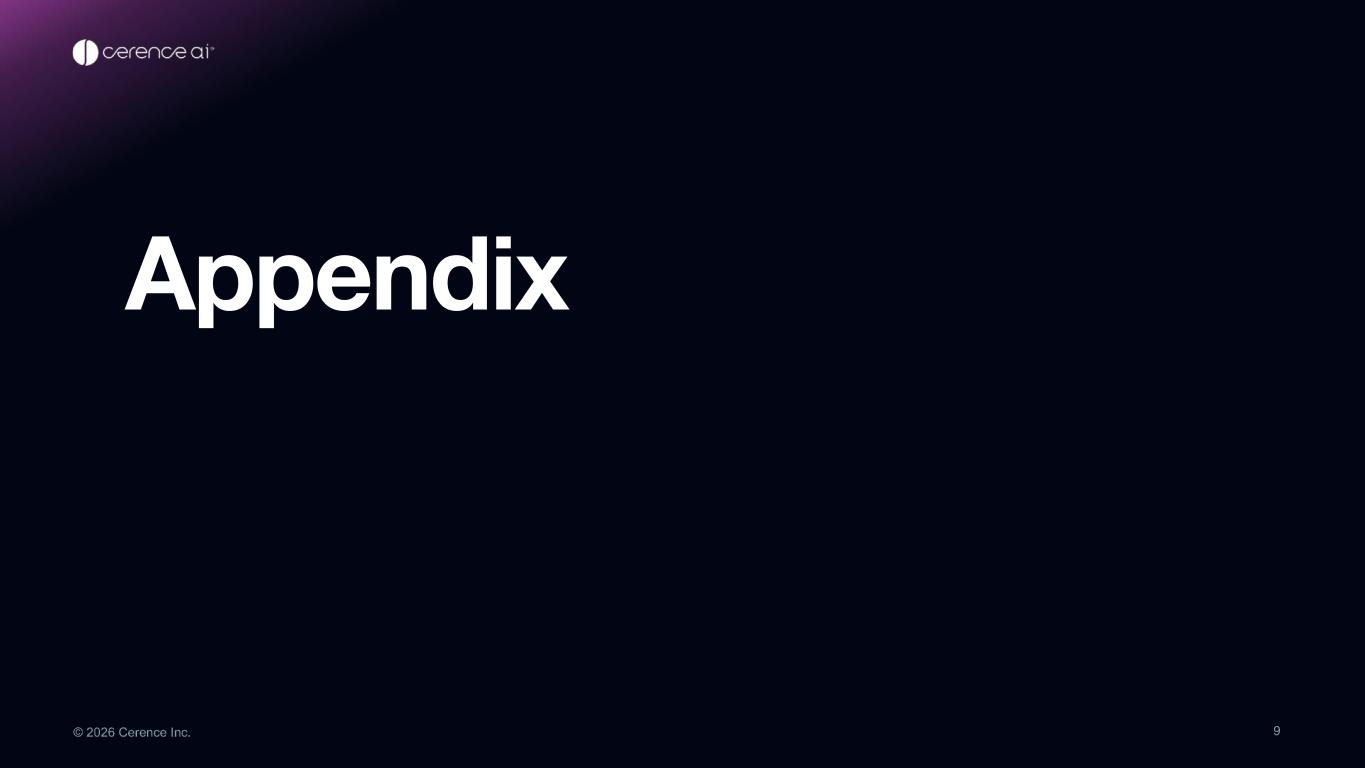 Forward-Looking Statements Statements in this presentation as well as oral statements made by Cerence management from time to time, regarding: Cerence’s future performance, results and financial condition; expected growth, profitability and cash flow; outlook and momentum; transformation plans and cost efficiency initiatives; strategy; opportunities; business, industry and market trends; plans and expectations regarding fixed license contracts and the impact on financial results; revenue visibility; backlog; revenue timing and mix; demand for Cerence products; innovation and new product offerings, including AI technology and Cerence xUI; expected benefits of technology partnerships; IP monetization and protection efforts; and management’s future expectations, anticipations, intentions, estimates, assumptions, beliefs, goals, objectives, targets, plans, outlook or prospects constitute forward-looking statements within the meaning of the Private Securities Litigation Reform Act of 1995. Any statements that are not statements of historical fact (including statements containing the words “believes,” “plans,” “goal,” “objective,” “anticipates,” “projects,” “forecasts,” “expects,” “intends,” “continues,” “will,” “may,” or “estimates” or similar expressions) should also be considered to be forward-looking statements. Although we believe forward-looking statements are based upon reasonable assumptions as of the date of this press release, such statements involve known and unknown risk, uncertainties and other factors, which may cause actual results or performance of the company to be materially different from any future results or performance expressed or implied by such forward-looking statements including but not limited to: the highly competitive and rapidly changing market in which we operate; adverse conditions in the automotive industry or the global economy more generally; volatility in the political, legal and regulatory environment in which we operate, including trade, tariffs and other policies implemented by the United States, actions taken by other countries in response or other changes in law and regulation applicable to us; the ongoing conflicts in Ukraine and the Middle East; risks of international operations, including in China; automotive production curtailment or delays; changes in customer forecasts and the timing and receipt of royalty reports; our inability to control and successfully manage our expenses and cash position; our inability to deliver improved financial results from process optimization efforts and cost reduction actions; pricing pressures from our customers; the impact on our business of the transition to a lower level of fixed license contracts, including the failure to achieve such a transition; our failure to win, renew or implement service contracts; the cancellation or postponement of existing contracts; the loss of business from any of our largest customers; effects of customer defaults; a decrease in the level of professional services projects; fluctuations in our financial and operating results, including as a result of licensing transactions and litigation settlements or judgments; our inability to successfully introduce new products, applications and services; our strategies to increase cloud offerings and deploy generative AI and large language models (LLMs) and shift to more recurring revenue streams; the inability to expand into adjacent or non-auto markets; the inability to recruit and retain qualified personnel; cybersecurity and data privacy incidents and compliance with global privacy and data security requirements; failure to protect our intellectual property; adverse developments related to our intellectual property enforcement litigation, the outcome of such litigation, or remedies that could be awarded in connection with such litigation; the evolving regulatory landscape governing artificial intelligence; defects or interruptions in service with respect to our products; fluctuating currency rates and interest rates; inflation; financial and credit market volatility; restrictions on our current and future operations under the terms of our debt; the use of cash to service or repay our debt; and our inability to generate sufficient cash from our operations; and the other factors discussed in our most recent Annual Report on Form 10-K, quarterly reports on Form 10-Q, and other filings with the Securities and Exchange Commission. We disclaim any obligation to update any forward-looking statements as a result of developments occurring after the date of this document. 2