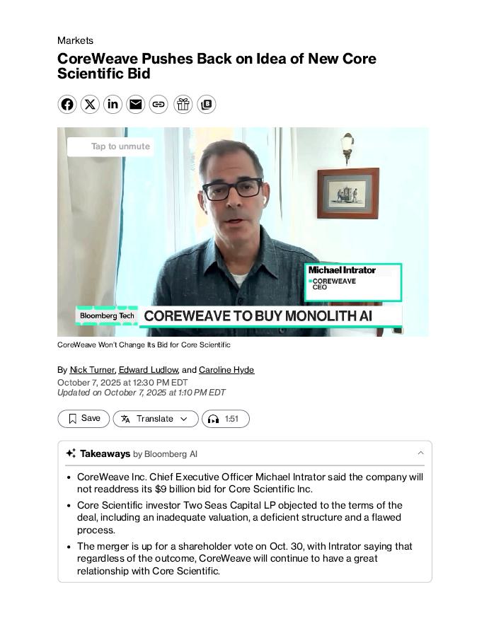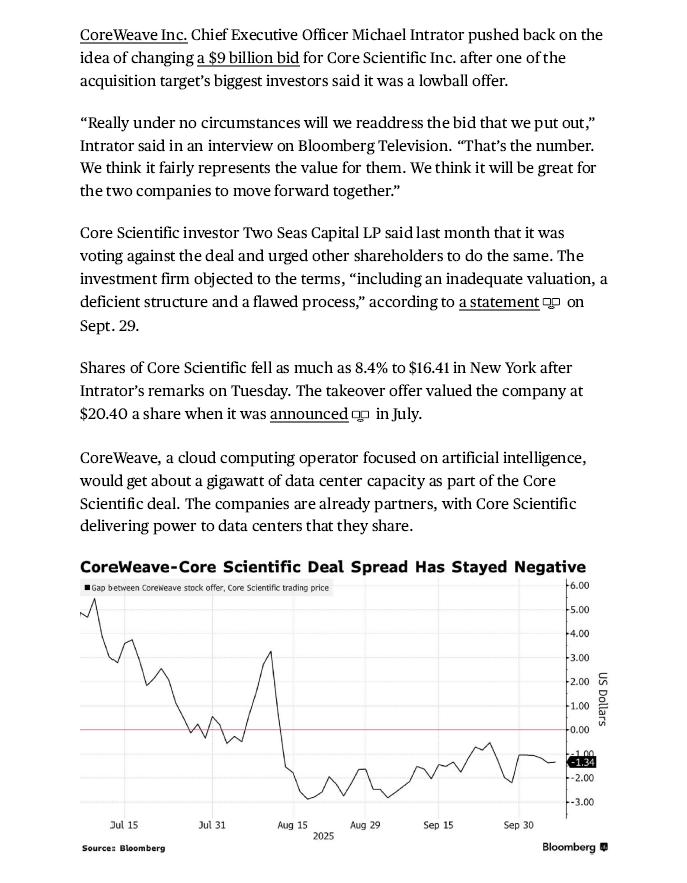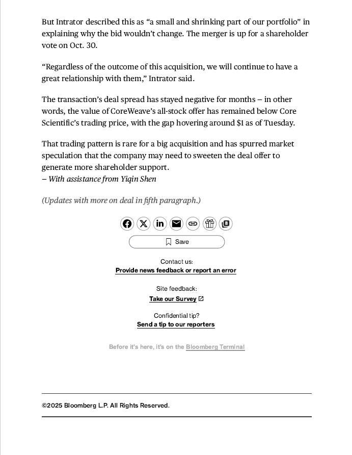 Save Contact us: P rovide news feedback or report an error Site feedback: T ake our Survey Confidential tip? S end a tip to our reporters Before it's here, it's on the B loomberg Terminal ©2025 Bloomberg L.P. All Rights Reserved. 10/7/25, 3:41 PM CoreWeave Pushes Back on Idea of Changing Core Scientific Bid - Bloomberg But Intrator described this as “a small and shrinking part of our portfolio” in explaining why the bid wouldn’t change . The merger is up for a shareholder vote on Oct . 30 . “Regardless of the outcome of this acquisition, we will continue to have a great relationship with them,” Intrator said. The transaction’s deal spread has stayed negative for months — in other words, the value of CoreWeave’s all - stock offer has remained below Core Scientific’s trading price, with the gap hovering around $1 as of Tuesday. That trading pattern is rare for a big acquisition and has spurred market speculation that the company may need to sweeten the deal offer to generate more shareholder support. — With assistance from Yiqin Shen (Updates with more on deal in fifth paragraph.) https://www.bloomberg.com/news/articles/2025 - 10 - 07/coreweave - pushes - back - on - idea - of - changing - core - scientific - bid 3 /3