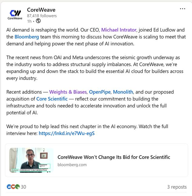 The following communication was posted by CoreWeave, Inc. on its LinkedIn account on October 7, 2025 in connection with CoreWeave's proposed acquisition of Core Scientific, Inc. and other acquisition activities.