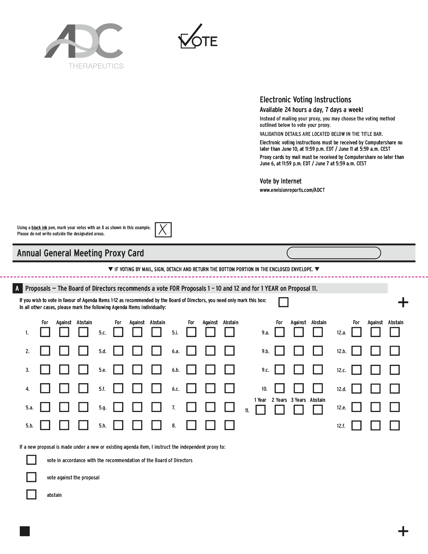 shareholders receive and lowers our printing and mailing costs. Shareholders who participate in householding will continue to be able to access and receive separate proxy cards. Upon written or oral request, we will promptly deliver a separate copy of the Notice and, if applicable, the proxy materials to any shareholder of record at a shared address to which we delivered a single copy of any of these materials. To receive a separate copy, such shareholder of record may contact Investor Relations, ADC Therapeutics SA, c/o ADC Therapeutics America, Inc. 430 Mountain Avenue, 4th Floor, Murray Hill, NJ 07974 or by calling (908) 731-5556. Beneficial holders may contact their bank, brokerage firm, or other nominee to request information about householding.