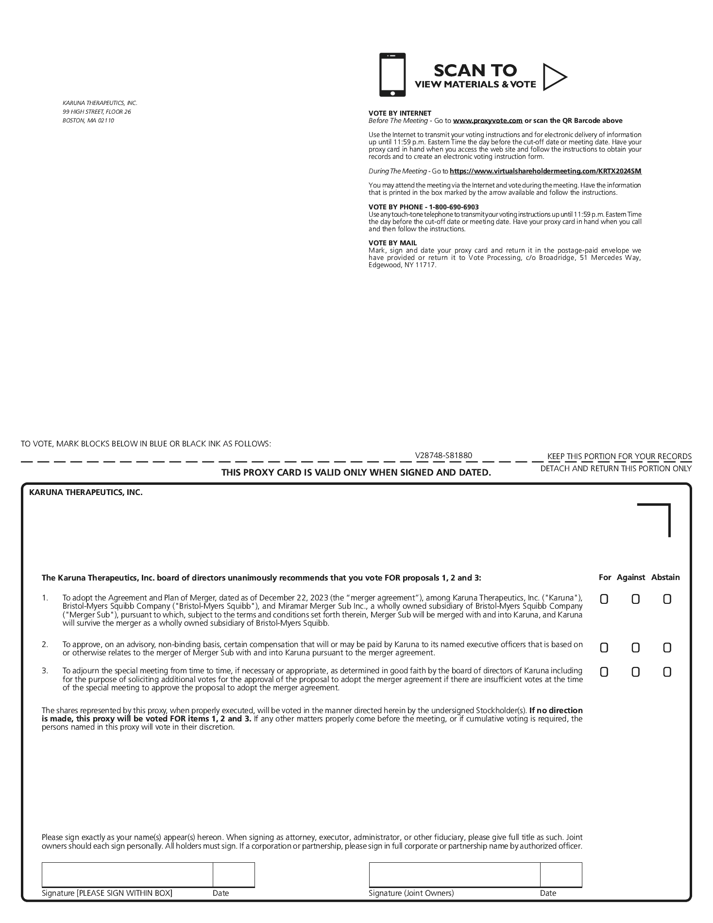 • To consider and vote on a proposal to adopt the Agreement and Plan of Merger, dated as of December 22, 2023 (as amended or modified from time to time, the “merger agreement”), among Karuna, Bristol-Myers Squibb Company (“Bristol-Myers Squibb”) and Miramar Merger Sub Inc., a wholly owned subsidiary of Bristol-Myers Squibb (“Merger Sub”) (the “merger proposal”), pursuant to which, subject to the terms and conditions set forth therein, Merger Sub will be merged with and into Karuna, the separate corporate existence of Merger Sub will cease, and Karuna will survive the merger as a wholly owned subsidiary of Bristol-Myers Squibb (the “merger”); a copy of the merger agreement is attached to the accompanying proxy statement as Annex A and is incorporated therein by reference;