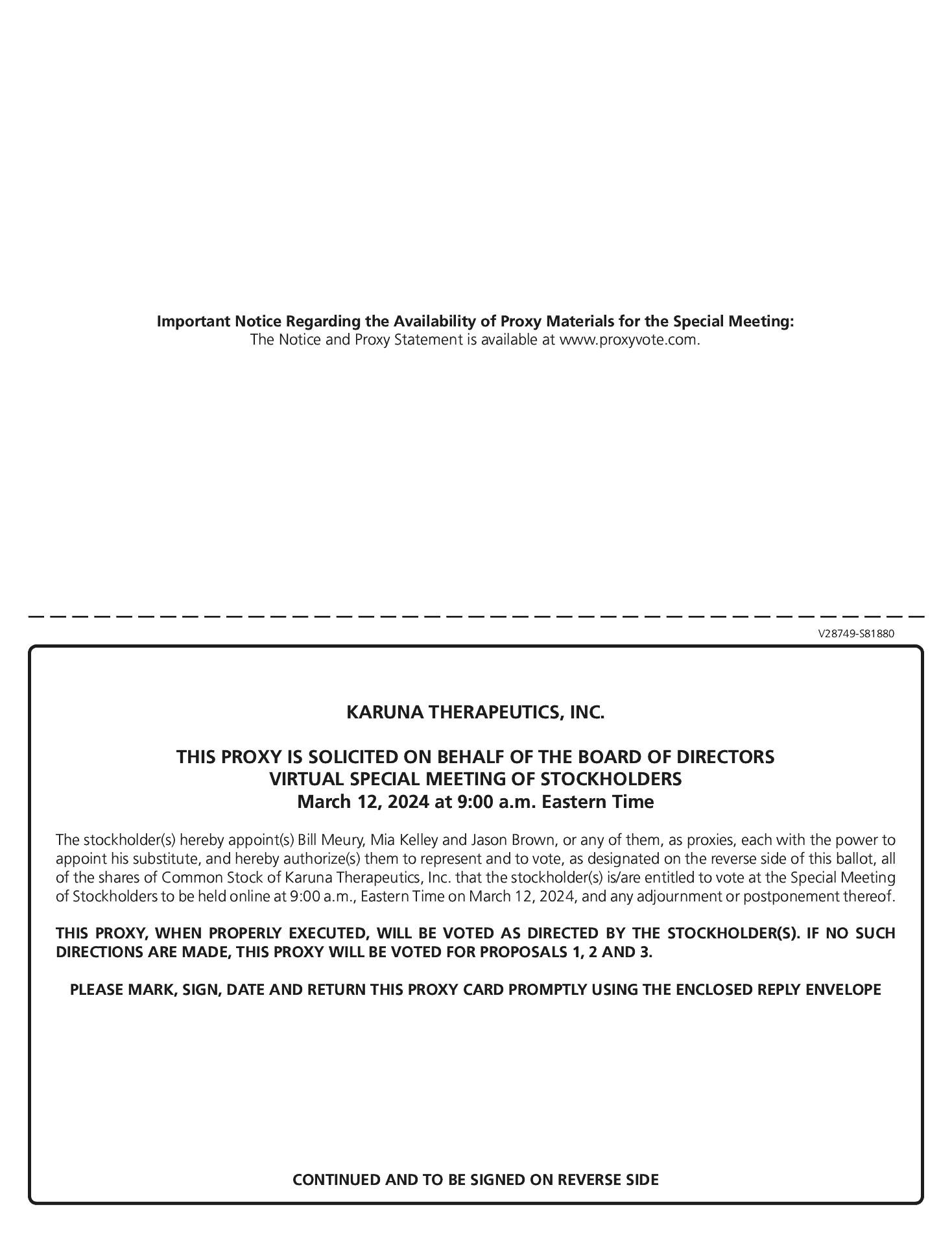 You are cordially invited to attend a special meeting of the stockholders of Karuna Therapeutics, Inc. (“Karuna”). The special meeting will be held online on March 12, 2024 at 9:00 a.m., Eastern Time (the “special meeting”). You may attend the meeting virtually via the internet at https://www.virtualshareholdermeeting.com/KRTX2024SM, where you will be able to vote electronically and submit questions. You will need the 16-digit control number, which is located on your proxy card or in the instructions accompanying your proxy materials, to attend the special meeting. You will not be able to attend the meeting in person.