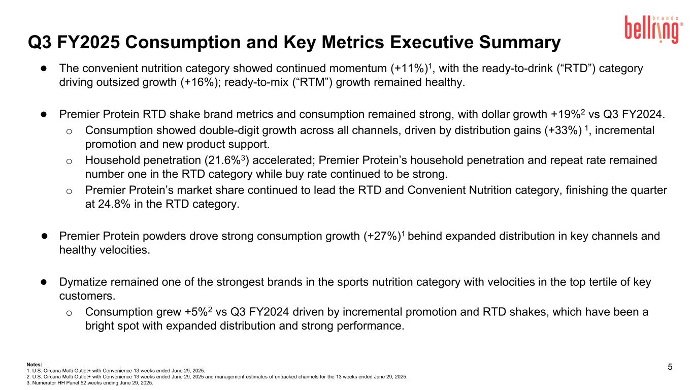 Additional Information 4 Prospective Information Any prospective information provided in this presentation regarding BellRing’s future performance, including BellRing’s plans, expectations, estimates and similar statements, represents BellRing management’s estimates as of August 4, 2025 only and are qualified by, and subject to, the assumptions and the other information set forth on the slide captioned “Cautionary Statement Regarding Forward-Looking Statements.” Prospective information provided in this presentation regarding BellRing’s plans, expectations, estimates and similar statements contained in this presentation are based upon a number of assumptions and estimates that, while they may be presented with numerical specificity, are inherently subject to business, economic and competitive uncertainties and contingencies, many of which are beyond BellRing’s control, are based upon specific assumptions with respect to future business decisions, some of which will change, and are necessarily speculative in nature. It can be expected that some or all of the assumptions of the estimates will not materialize or will vary significantly from actual results. Accordingly, the information set forth herein is only an estimate as of August 4, 2025, and actual results will vary from the estimates set forth herein. It should be recognized that the reliability of any forecasted financial data diminishes the farther in the future that the data is forecast. In light of the foregoing, investors should put all prospective information in context and not rely on it. Any failure to successfully implement BellRing’s operating strategy or the occurrence of the events or circumstances set forth under “Cautionary Statement Regarding Forward- Looking Statements” could result in the actual operating results being different than the estimates set forth herein, and such differences may be adverse and material. Market and Industry Data This presentation includes industry and trade association data, forecasts and information that were prepared based, in part, upon data, forecasts and information obtained from independent trade associations, industry publications and surveys and other independent sources available to BellRing. Some data also is based on BellRing management’s good faith estimates, which are derived from management’s knowledge of the industry and from independent sources. These third-party publications and surveys generally state that the information included therein has been obtained from sources believed to be reliable, but that the publications and surveys can give no assurance as to the accuracy or completeness of such information. BellRing has not independently verified any of the data from third-party sources nor has it ascertained the underlying economic assumptions on which such data are based. Similarly, BellRing believes its internal research is reliable, even though such research has not been verified by any independent sources and BellRing cannot guarantee its accuracy or completeness. Trademarks and Service Marks Logos, trademarks, trade names and service marks mentioned in this presentation, including BellRing®, BellRing Brands®, Premier Protein®, Dymatize®, PowerBar®, Premier Protein Clear®, ISO.100®, Elite Mass®, Elite Whey Protein®, Elite 100% Whey®, Super Mass Gainer®, All9 Amino®, Pebbles®, Dunkin®, PREW.O®, Athlete’s BCAA®, PowerBar Clean WheyTM, PowerBar Protein PlusTM, Protein Nut2TM and PowerBar EnergizeTM, are currently the property of, or are under license by, BellRing or one of its subsidiaries. BellRing or one of its subsidiaries owns or has rights to use the trademarks, service marks and trade names that are used in conjunction with the operation of BellRing or its subsidiaries’ businesses. Some of the more important trademarks that BellRing or one of its subsidiaries owns or has rights to use that appear in this presentation may be registered in the United States (“U.S.”) and other jurisdictions. Each logo, trademark, trade name or service mark of any other company appearing in this presentation is owned or used under license by such company.