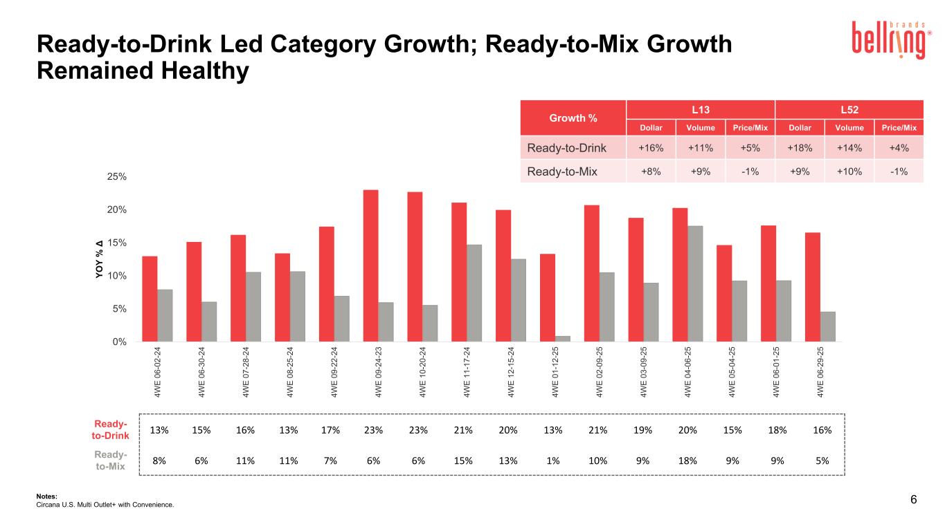 5 Q3 FY2025 Consumption and Key Metrics Executive Summary ● The convenient nutrition category showed continued momentum (+11%)1, with the ready-to-drink (“RTD”) category driving outsized growth (+16%); ready-to-mix (“RTM”) growth remained healthy. ● Premier Protein RTD shake brand metrics and consumption remained strong, with dollar growth +19%2 vs Q3 FY2024. o Consumption showed double-digit growth across all channels, driven by distribution gains (+33%) 1, incremental promotion and new product support. o Household penetration (21.6%3) accelerated; Premier Protein’s household penetration and repeat rate remained number one in the RTD category while buy rate continued to be strong. o Premier Protein’s market share continued to lead the RTD and Convenient Nutrition category, finishing the quarter at 24.8% in the RTD category. ● Premier Protein powders drove strong consumption growth (+27%)1 behind expanded distribution in key channels and healthy velocities. ● Dymatize remained one of the strongest brands in the sports nutrition category with velocities in the top tertile of key customers. o Consumption grew +5%2 vs Q3 FY2024 driven by incremental promotion and RTD shakes, which have been a bright spot with expanded distribution and strong performance. Notes: 1. U.S. Circana Multi Outlet+ with Convenience 13 weeks ended June 29, 2025. 2. U.S. Circana Multi Outlet+ with Convenience 13 weeks ended June 29, 2025 and management estimates of untracked channels for the 13 weeks ended June 29, 2025. 3. Numerator HH Panel 52 weeks ending June 29, 2025.