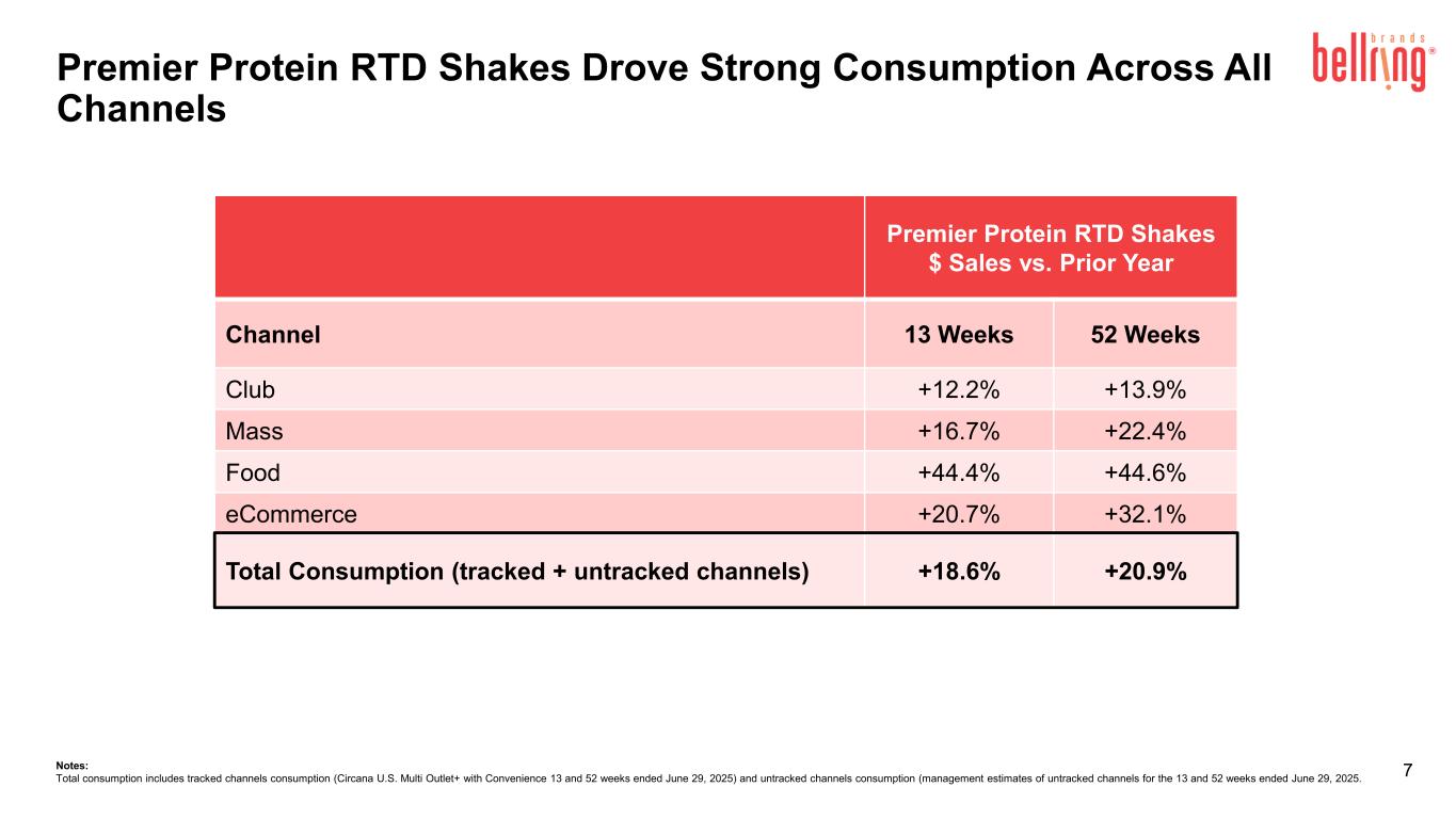 6 Ready-to-Drink Led Category Growth; Ready-to-Mix Growth Remained Healthy Notes: Circana U.S. Multi Outlet+ with Convenience. Ready- to-Drink 13% 15% 16% 13% 17% 23% 23% 21% 20% 13% 21% 19% 20% 15% 18% 16% Ready- to-Mix 8% 6% 11% 11% 7% 6% 6% 15% 13% 1% 10% 9% 18% 9% 9% 5% 0% 5% 10% 15% 20% 25% 4 W E 0 6 -0 2 -2 4 4 W E 0 6 -3 0 -2 4 4 W E 0 7 -2 8 -2 4 4 W E 0 8 -2 5 -2 4 4 W E 0 9 -2 2 -2 4 4 W E 0 9 -2 4 -2 3 4 W E 1 0 -2 0 -2 4 4 W E 1 1 -1 7 -2 4 4 W E 1 2 -1 5 -2 4 4 W E 0 1 -1 2 -2 5 4 W E 0 2 -0 9 -2 5 4 W E 0 3 -0 9 -2 5 4 W E 0 4 -0 6 -2 5 4 W E 0 5 -0 4 -2 5 4 W E 0 6 -0 1 -2 5 4 W E 0 6 -2 9 -2 5 Y O Y % Δ Growth % L13 L52 Dollar Volume Price/Mix Dollar Volume Price/Mix Ready-to-Drink +16% +11% +5% +18% +14% +4% Ready-to-Mix +8% +9% -1% +9% +10% -1%