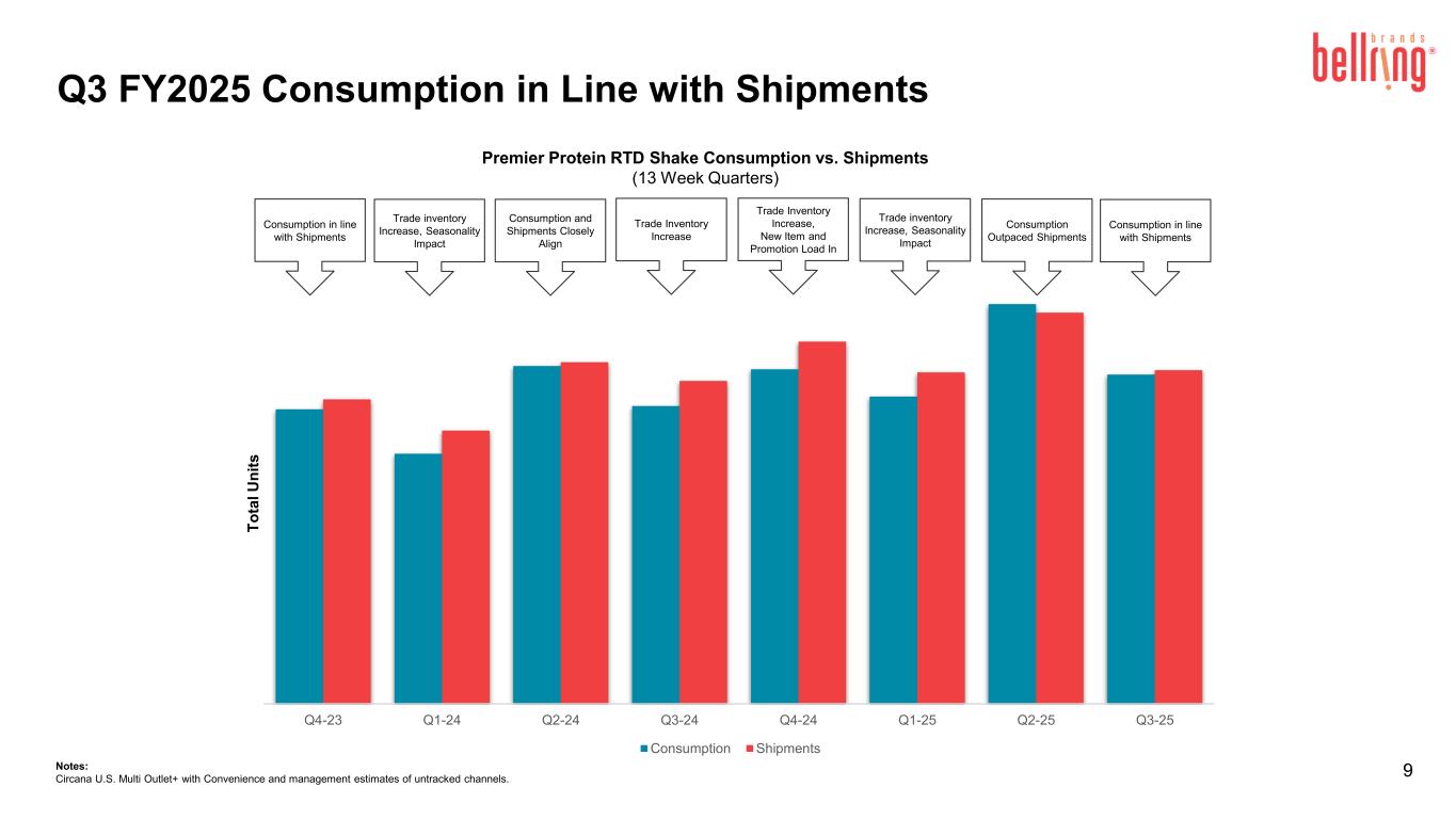 Ju l 3 0' 23 Au g 27 '2 3 O ct 1 '2 3 O ct 2 9' 23 N ov 2 6' 23 D ec 3 1' 23 Ja n 28 '2 4 M ar 3 '2 4 M ar 3 1' 24 Ap r 2 8' 24 M ay 3 1' 24 Ju n 30 '2 4 Ju l 2 8' 24 Se p 01 '2 4 Se p 29 '2 4 N ov 3 '2 4 D ec 1 '2 4 D ec 2 9' 24 Fe b 2' 25 M ar 2 '2 5 M ar 3 0' 25 Ap r 2 7' 25 Ju n 1' 20 25 Ju n 29 '2 5 $ Vo lu m e Premier Protein RTD Shakes Rolling 13 week Total $ Consumption Sales 8Notes: Circana U.S. Multi Outlet+ with Convenience and management estimates of untracked channels. Q4 Q1 Q2 Q3 Q4 Q1 Q2 Q3 +36% +29% +29% +10% +14% +23% +25% +19% YOY % Δ Premier Protein RTD Consumption Continued to Deliver Strong Quarterly Growth Major Club Promotions