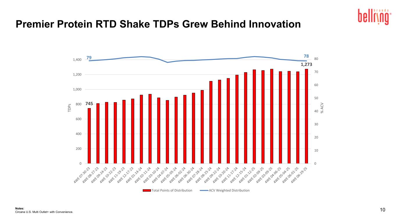 9 Q3 FY2025 Consumption in Line with Shipments Premier Protein RTD Shake Consumption vs. Shipments (13 Week Quarters) Notes: Circana U.S. Multi Outlet+ with Convenience and management estimates of untracked channels. Consumption and Shipments Closely Align Trade Inventory Increase Trade Inventory Increase, New Item and Promotion Load In Consumption Outpaced Shipments Consumption in line with Shipments Trade inventory Increase, Seasonality Impact Consumption in line with Shipments Trade inventory Increase, Seasonality Impact Q4-23 Q1-24 Q2-24 Q3-24 Q4-24 Q1-25 Q2-25 Q3-25 T o ta l U n it s Consumption Shipments