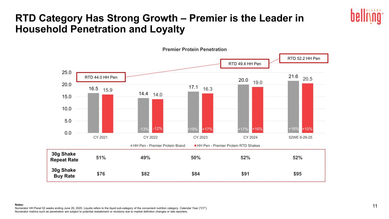 10 Premier Protein RTD Shake TDPs Grew Behind Innovation Notes: Circana U.S. Multi Outlet+ with Convenience. 745 1,273 79 78 0 10 20 30 40 50 60 70 80 0 200 400 600 800 1,000 1,200 1,400 % A C V TD P s Total Points of Distribution ACV Weighted Distribution