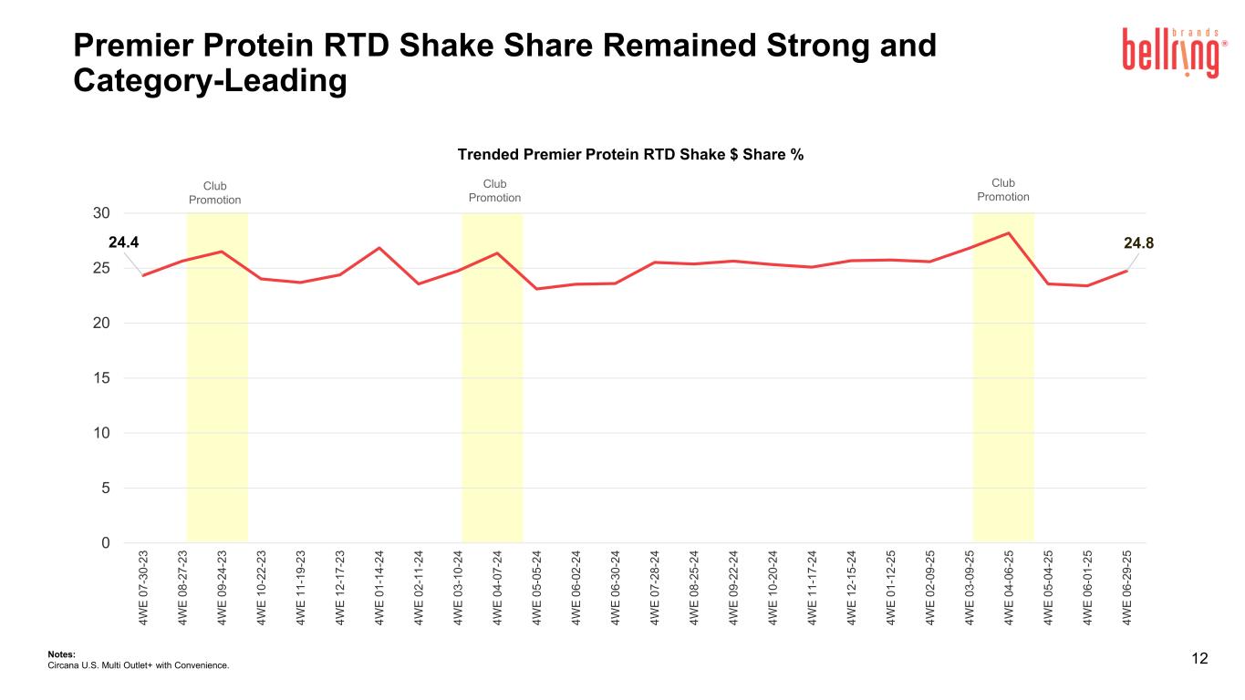 16.5 14.4 17.1 20.0 21.6 15.9 14.0 16.3 19.0 20.5 0.0 5.0 10.0 15.0 20.0 25.0 CY 2021 CY 2022 CY 2023 CY 2024 52WE 6-29-25 Premier Protein Penetration HH Pen - Premier Protein Brand HH Pen - Premier Protein RTD Shakes RTD Category Has Strong Growth – Premier is the Leader in Household Penetration and Loyalty 11 30g Shake Repeat Rate 51% 49% 50% 52% 52% 30g Shake Buy Rate $76 $82 $84 $91 $95 RTD 44.0 HH Pen RTD 52.2 HH Pen RTD 49.4 HH Pen +16%+17%-12% +17%+19%-13% +15%+16% Notes: Numerator HH Panel 52 weeks ending June 29, 2025. Liquids refers to the liquid sub-category of the convenient nutrition category. Calendar Year (“CY”). Numerator metrics such as penetration are subject to potential restatement or revisions due to market definition changes or late reporters.