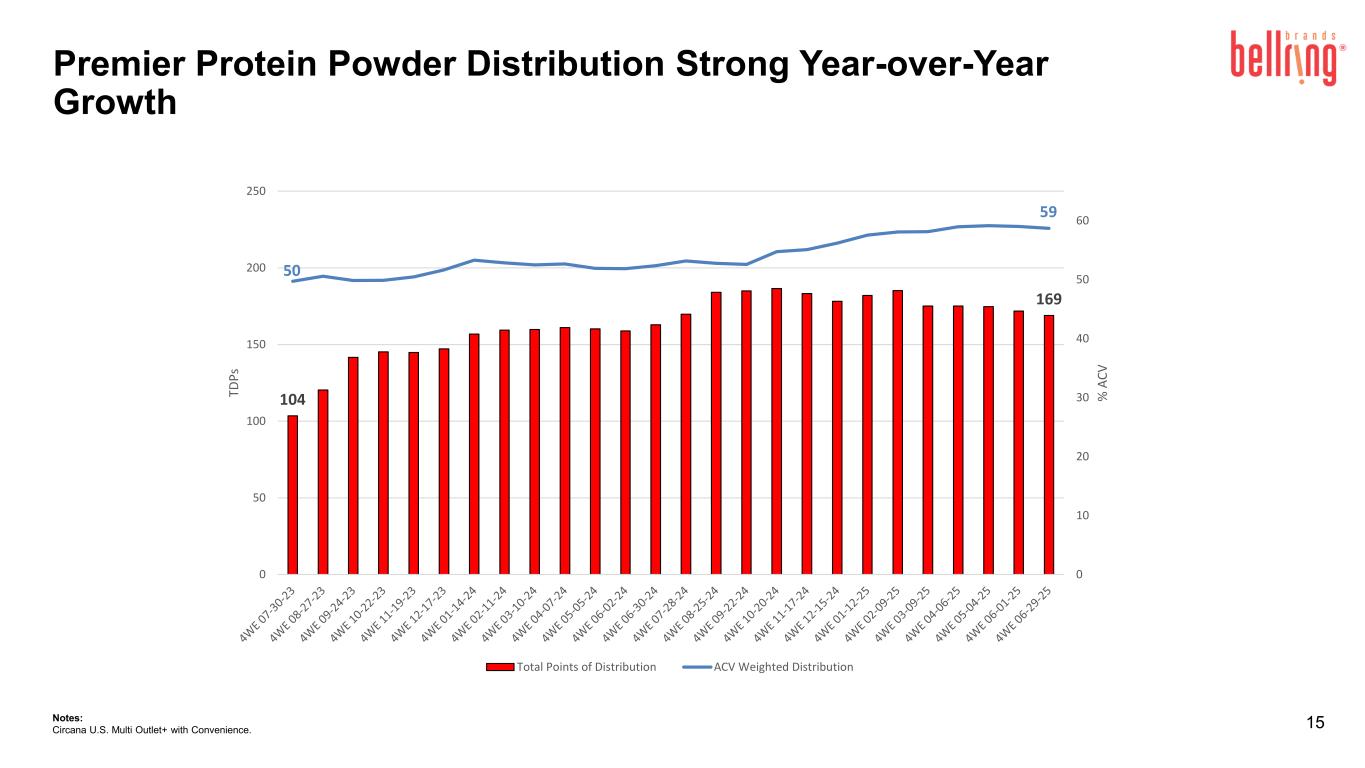 Premier Protein Powders Continued Strong Growth Trajectory 14Notes: Circana U.S. Multi Outlet+ with Convenience. Q4 Q1 Q2 Q3 Q4 Q1 Q2 Q3 +55% +66% +52% +44% +43% +24% +22% +27% YOY % Δ Ju l 3 0' 23 Au g 27 '2 3 O ct 1 '2 3 O ct 2 9' 23 N ov 2 6' 23 D ec 3 1' 23 Ja n 28 '2 4 M ar 3 '2 4 M ar 3 1' 24 Ap r 2 8' 24 M ay 3 1' 24 Ju n 30 '2 4 Ju l 2 8' 24 Se p 01 '2 4 Se p 29 '2 4 N ov 3 '2 4 D ec 1 '2 4 D ec 2 9' 24 Fe b 2' 25 M ar 2 '2 5 M ar 3 0' 25 Ap r 2 7' 25 Ju n 1' 20 25 Ju n 29 '2 5 $ Vo lu m e Premier Protein Ready-to-Mix Powders Rolling 13 week Total $ Consumption Sales