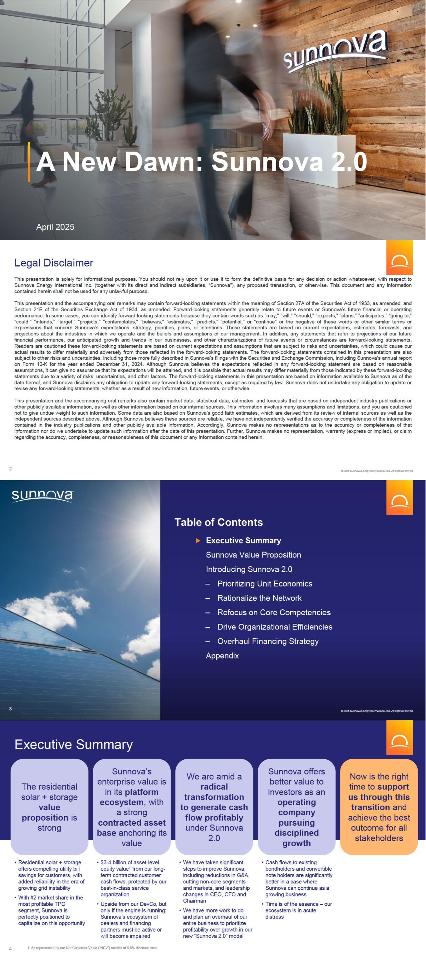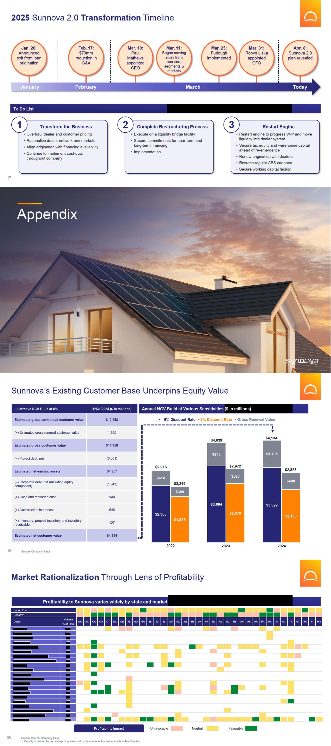 $, Millions 2038 2039 2040 2041 2042 2043 2044 2045 2046 2047 2048 2049 Total Current ABS 2019-A Sunnova Helios III Issuer LLC – – – – – – – – – – – – $8.4 2020-A Sunnova Helios IV Issuer LLC – – – – – – – – – – – – 9.7 2021-A Sunnova Helios V Issuer LLC 0.4 – – – – – – – – – – – 11.3 2021-B Sunnova Helios VI Issuer LLC – – – – – – – – – – – – 16.6 2021-C Sunnova Helios VII Issuer LLC 0.8 0.5 – – – – – – – – – – 12.8 2022-A Sunnova Helios VIII Issuer LLC 1.7 0.3 – – – – – – – – – – 25.5 2022-B Sunnova Helios IX Issuer LLC 1.4 1.4 0.2 – – – – – – – – – 22.6 2022-C Sunnova Helios X Issuer LLC 1.6 1.6 0.7 – – – – – – – – – 25.5 2023-A Sunnova Helios XI Issuer LLC 2.1 2.1 1.2 – – – – – – – – – 34.2 2023-B Sunnova Helios XII Issuer LLC 1.6 1.6 1.1 – – – – – – – – – 26.2 2023-GRID-1 Sunnova Hestia I Borrower LLC 1.7 1.7 0.8 – – – – – – – – – 27.2 2024-A Sunnova Helios XIII Issuer LLC 1.4 1.4 0.8 – – – – – – – – – 22.7 2024-B Sunnova Helios XIV Issuer LLC 1.4 1.4 0.9 – – – – – – – – – 22.5 2024-GRID-1 Sunnova Hestia II Borrower LLC 1.1 1.1 1.1 0.1 – – – – – – – – 19.0 2018-1 Sunnova ABS Holdings LLC 2.9 2.2 – – – – – – – – – – 39.1 2019-1 Sunnova RAYS I Holdings LLC – – – – – – – – – – – – 26.0 2020-1 Sunnova Sol Holdings LLC 6.8 5.2 – – – – – – – – – – 92.9 2020-2 Sunnova Sol II Holdings LLC 4.1 4.2 3.2 – – – – – – – – – 60.5 2021-1 Sunnova Sol III Holdings LLC 4.1 4.2 4.2 – – – – – – – – – 61.1 2022-1 Sunnova Sol IV Holdings LLC 6.3 6.4 6.5 6.5 6.6 6.7 6.8 6.8 6.2 0.1 – – 133.7 2023-1 Sunnova Sol V Holdings LLC 6.4 6.5 6.6 6.7 6.7 6.8 6.9 7.0 7.1 6.9 0.8 0.0 144.7 2024-1 Sunnova Sol VI Holdings LLC 5.2 5.3 5.3 5.4 5.5 5.5 5.6 5.7 1.4 – – – 106.6 2024-2 Sunnova Sol VII Holdings LLC 4.1 4.2 4.2 4.3 4.3 4.4 4.4 0.4 – – – – 79.2 2024-3 Sunnova Sol VIII Holdings LLC 3.6 3.7 3.7 3.8 3.8 3.9 3.9 4.0 4.0 2.7 – – 79.9 2024-PR1 Sunnova Aurora 1 LLC 2.1 2.1 2.1 2.2 2.2 2.2 0.9 – – – – – 38.6 2025-P1 Sunnova SOL IX LLC 3.7 3.8 3.8 3.9 3.6 – – – – – – – 62.8 Subtotal Current ABS $64.9 $60.7 $46.6 $32.8 $32.7 $29.5 $28.5 $23.8 $18.7 $9.7 $0.8 $0.0 $1,209.5 Future ABS TEP 8-A TEP 8-A $1.1 $1.2 $1.2 $1.2 $1.2 $1.2 $1.2 $1.2 $1.3 $1.3 $1.3 $1.3 $28.2 TEP 8-B TEP 8-B 3.8 3.9 3.9 4.0 4.0 4.1 4.1 4.2 4.2 4.3 4.3 4.4 94.0 TEP 8-D TEP 8-D 2.7 2.8 2.8 2.8 2.9 2.9 2.9 3.0 3.0 3.0 3.1 3.1 67.1 TEP 8-E TEP 8-E 3.6 3.7 3.7 3.8 3.8 3.8 3.9 3.9 4.0 4.0 4.1 4.1 89.3 TEP 8-F TEP 8-F 2.5 2.5 2.6 2.6 2.6 2.7 2.7 2.7 2.8 2.8 2.8 2.9 61.7 TEP 8-G TEP 8-G 1.3 1.3 1.3 1.3 1.3 1.4 1.4 1.4 1.4 1.4 1.4 1.5 31.5 TEP 8-I TEP 8-I 0.4 0.4 0.4 0.4 0.4 0.4 0.4 0.5 0.5 0.5 0.5 0.5 10.4 Subtotal Future ABS $15.5 $15.7 $15.9 $16.1 $16.3 $16.5 $16.7 $16.9 $17.1 $17.3 $17.5 $17.7 $382.3 Total ABS $80.4 $76.4 $62.4 $48.8 $49.0 $45.9 $45.2 $40.7 $35.8 $26.9 $18.3 $17.7 $1,591.8 MSA Fee Details (2038 – 2049) Source: Company Provided Materials as of 04/30/2025 Note: All ABS facilities assumed to launch at the end of the year49 Analysis based on existing outstanding ABS transactions only and excludes any cash flows associated with new originations, new ABS issuances and new tax equity funding in $ millions Series Issuer EU Risk Retention? ARD Date 2025 2026 2027 2028 2029 2030 2031 2032 2033 2034 2035 2036 2037 2019-A HELIII Yes 6/20/2029 $9.6 $12.8 $12.5 $12.2 $12.0 $11.7 $11.5 $11.2 $10.9 $10.6 $10.3 $11.9 $10.3 2020-A HELIV Yes 6/21/2027 9.7 12.8 12.5 12.2 11.8 11.4 11.1 10.8 10.5 10.1 9.8 9.4 12.8 2021-A HELV Yes 2/21/2028 10.5 14.0 13.6 13.2 13.2 13.3 12.9 12.6 12.2 11.8 11.4 11.0 10.7 2021-B HELVI Yes 7/20/2028 14.3 19.0 18.4 18.0 18.1 18.5 18.0 17.5 17.0 16.3 15.5 15.0 14.5 2021-C HELVII Yes 10/20/2028 9.5 12.7 13.0 12.8 12.5 12.2 11.8 11.5 11.1 10.8 10.4 10.0 9.7 2022-A HELVIII Yes 2/20/2029 19.6 26.1 25.3 24.6 25.2 25.3 24.6 23.9 23.2 22.6 21.8 20.9 20.2 2022-B HELIX Yes 8/20/2029 18.5 24.7 23.9 23.3 22.3 21.2 20.6 20.0 19.4 18.8 18.8 19.4 18.8 2022-C HELX No 11/22/2027 19.2 25.6 24.6 23.2 22.6 22.0 21.3 20.7 20.4 21.3 20.6 19.6 18.9 2023-A HELXI No 5/22/2028 24.6 32.8 31.9 30.3 29.1 28.3 27.5 26.7 25.9 26.2 26.3 25.2 24.4 2023-B HELXII No 8/21/2028 20.4 27.3 26.5 25.5 24.4 24.3 24.4 23.8 23.1 22.4 21.8 21.1 20.3 2024-A HELXIII No 2/28/2031 19.2 25.7 25.0 24.4 23.9 23.3 22.2 21.5 20.8 21.1 20.5 19.9 19.0 2024-B HELXIV No 6/20/2034 19.7 29.3 28.6 28.0 27.4 26.8 26.2 25.6 25.0 24.0 23.1 22.5 21.6 2023-GRID-1 Hestia I No 8/21/2028 21.8 29.1 28.3 27.2 26.0 25.3 24.6 24.0 23.3 22.6 22.0 21.1 21.4 2024-GRID-1 Hestia II No 6/20/2034 15.4 21.0 20.5 20.0 19.6 19.1 18.7 18.2 17.7 16.9 16.2 15.5 14.8 Total Loan Unlevered Free Cash Flows $232.1 $313.0 $304.7 $295.2 $288.0 $282.7 $275.5 $267.9 $260.8 $255.5 $248.2 $242.4 $237.4 Cumulative $232.1 $545.1 $849.8 $1,145.0 $1,433.0 $1,715.7 $1,991.1 $2,259.0 $2,519.8 $2,775.4 $3,023.6 $3,266.0 $3,503.4 2018-1 HELII No 1/22/2029 $16.1 $21.4 $21.6 $21.8 $22.0 $22.2 $22.5 $22.7 $23.0 $23.2 $23.5 $23.7 $23.8 2019-1 RAYS No 4/30/2031 8.9 11.9 12.1 12.1 12.3 12.5 12.7 14.1 14.3 14.5 14.7 26.6 16.7 2020-1 SOLI Yes 1/30/2030 22.3 29.7 30.1 30.5 30.9 31.3 31.8 32.2 34.6 36.6 37.0 36.9 37.4 2020-2 SOLII Yes 10/30/2030 13.1 19.3 19.5 19.7 19.9 20.2 20.4 20.6 20.9 21.1 21.9 22.0 22.3 2021-1 SOLIII Yes 4/30/2031 20.5 29.9 30.8 31.1 31.3 31.6 31.8 32.1 32.4 33.6 34.9 35.1 35.1 2022-1 SOLIV Yes 6/30/2029 28.6 37.1 35.9 35.0 34.9 34.9 34.8 34.7 34.5 34.4 34.2 34.0 33.8 2023-1 SOLV No 7/31/2028 26.2 34.5 34.6 34.3 32.6 29.9 30.0 30.1 30.3 30.4 33.0 33.2 33.3 2024-1 SOLVI No 4/30/2032 15.0 19.9 19.9 19.9 23.5 23.4 23.4 23.4 23.5 23.5 23.6 25.2 25.8 2024-2 SOLVII No 8/1/2033 22.6 30.1 30.2 30.3 30.0 32.7 34.3