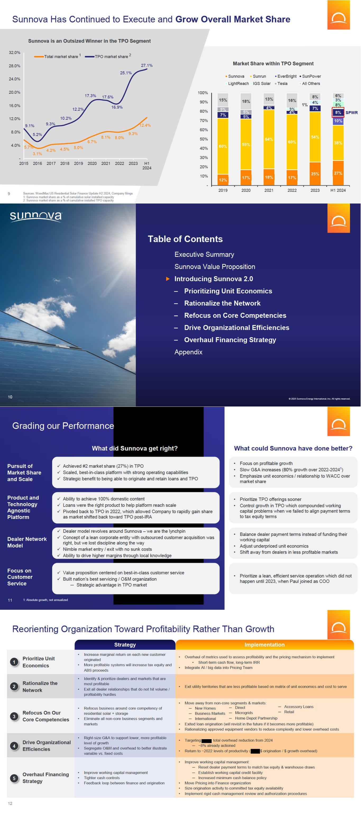 in $ millions Series Issuer EU Risk Retention? ARD Date 2038 2039 2040 2041 2042 2043 2044 2045 2046 2047 2048 2049 Total 2019-A HELIII Yes 6/20/2029 $9.4 $1.9 - - - - - - - - - - $42.0 2020-A HELIV Yes 6/21/2027 4.6 8.8 2.1 - - - - - - - - - 17.4 2021-A HELV Yes 2/21/2028 - - - - - - - - - - - - 0.0 2021-B HELVI Yes 7/20/2028 10.1 14.2 13.6 4.1 - - - - - - - - 57.2 2021-C HELVII Yes 10/20/2028 - - - - - - - - - - - - 6.9 2022-A HELVIII Yes 2/20/2029 - - 5.1 17.0 0.0 - - - - - - - 28.7 2022-B HELIX Yes 8/20/2029 - - 6.5 17.1 1.4 - - - - - - - 32.6 2022-C HELX No 11/22/2027 - - - - - - - - - - - - 0.0 2023-A HELXI No 5/22/2028 - - - - 18.5 1.4 - - - - - - 35.6 2023-B HELXII No 8/21/2028 - - - 5.6 17.9 3.9 - - - - - - 43.6 2024-A HELXIII No 2/28/2031 - - - 9.4 16.5 2.3 - - - - - - 49.5 2024-B HELXIV No 6/20/2034 17.7 20.3 19.7 33.8 17.9 0.0 - - - - - - 112.0 2023-GRID-1 Hestia I No 8/21/2028 - - 14.0 32.9 17.4 0.0 - - - - - - 70.3 2024-GRID-1 Hestia II No 6/20/2034 - - - 18.8 13.6 1.8 - - - - - - 62.6 Total Loan Residuals $41.8 $45.2 $60.9 $138.7 $103.1 $9.4 - - - - - - $558.3 Cumulative $201.0 $246.2 $307.2 $445.8 $548.9 $558.3 $558.3 $558.3 $558.3 $558.3 $558.3 $558.3 2018-1 HELII No 1/22/2029 $1.7 $21.4 $25.1 $17.4 $5.6 $1.1 - - - - - - 78.0 2019-1 RAYS No 4/30/2031 17.0 17.3 17.6 17.8 15.2 2.3 0.0 - - - - - 124.0 2020-1 SOLI Yes 1/30/2030 - - 49.8 34.6 33.1 28.8 11.8 0.2 - - - - 163.6 2020-2 SOLII Yes 10/30/2030 - - 11.4 26.8 26.6 25.7 24.9 6.9 - - - - 128.9 2021-1 SOLIII Yes 4/30/2031 35.4 35.7 30.9 36.3 16.5 16.7 16.8 12.0 0.6 0.0 - - 289.6 2022-1 SOLIV Yes 6/30/2029 - - - 10.8 29.1 29.3 29.6 28.9 9.4 2.8 2.8 2.7 172.5 2023-1 SOLV No 7/31/2028 - - - - - - 16.6 27.5 25.8 8.7 1.0 1.0 100.0 2024-1 SOLVI No 4/30/2032 - - - - - 10.4 19.1 19.2 36.2 20.4 9.0 0.0 128.2 2024-2 SOLVII No 8/1/2033 - - - - - 12.9 38.6 61.6 41.6 41.8 34.9 3.0 254.4 2024-3 SOLVIII No 7/30/2033 - - - - - - - 7.5 34.6 34.9 39.5 0.8 132.4 2024-PR1 Aurora I No 1/30/2030 - - - 11.0 23.6 23.4 23.2 57.0 26.2 23.7 6.2 0.0 197.0 2025-P1 SOLIX No 1/30/2033 - - - - 18.7 57.3 38.6 38.9 39.2 39.6 39.0 6.6 289.8 Total TPO Residuals $54.1 $74.4 $134.8 $154.7 $168.5 $208.0 $219.1 $259.6 $213.6 $171.8 $132.3 $14.2 $2,058.4 Cumulative $307.4 $381.8 $516.6 $671.3 $839.8 $1,047.8 $1,266.9 $1,526.5 $1,740.1 $1,911.9 $2,044.2 $2,058.4 Total Loan & TPO Residuals $95.9 $119.6 $195.7 $293.4 $271.6 $217.3 $219.1 $259.6 $213.6 $171.8 $132.3 $14.2 $2,616.7 Cumulative $508.4 $628.0 $823.7 $1,117.1 $1,388.7 $1,606.1 $1,825.2 $2,084.8 $2,298.4 $2,470.2 $2,602.6 $2,616.7 Illustrative Post ARD Turbo Amortization Scenario Estimated ABS Residual Cash Flows (January 2038 – December 2049) Analysis based on existing outstanding ABS transactions only and excludes any cash flows associated with new originations, new ABS issuances and new tax equity funding Source: Company Provided Materials as of 05/01/2025 53 Legend Pre-ARD Cash Flows Post-ARD Cash Flows Overview of Other Unencumbered Assets1 56 (1) In addition to other unencumbered assets such as EU Risk Retention cash flows (2) Estimated net equity proceeds if the transaction was illustratively refinanced, based on current market conditions Asset Description Illustrative Undiscounted Book Value 2019-1 RAYS ABS • Equity value of 2019 vintage ABS deal with ~$150mm of ADSAB which has completed tax equity buyout. Currently encumbered by ABS deal which could be repaid for $95mm (net of make-whole) • Illustrative proceeds are estimated at range of $17 – $25mm ~$17 – 25mm 2 SNH WIP • In-progress residential solar installations with varying levels of completion ~$2mm Accessory Loans • Additional loans made in connection with loans, leases, & PPAs for customer financing of primarily roof construction ~$11mm 2024 ITCs • Investment Tax Credits (“ITCs”) provided by the federal government and related to residential and corporate solar projects in 2024 accrued via TPOs ~$44mm Total ~$74 – $82mm