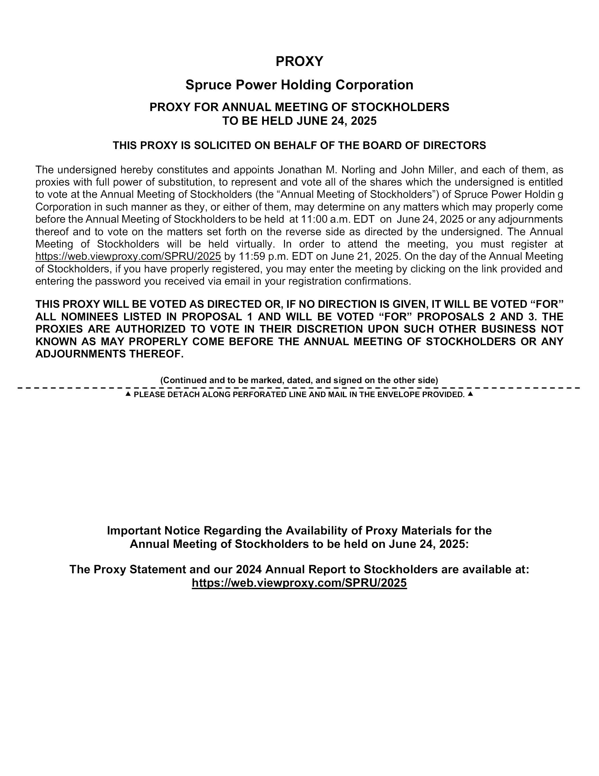 PROXY Spruce Power Holding Corporation PROXY FOR ANNUAL MEETING OF STOCKHOLDERS TO BE HELD JUNE 24, 2025 THIS PROXY IS SOLICITED ON BEHALF OF THE BOARD OF DIRECTORS The undersigned hereby constitutes and appoints Jonathan M. Norling and John Miller, and each of them, as proxies with full power of substitution, to represent and vote all of the shares which the undersigned is entitled to vote at the Annual Meeting of Stockholders (the “Annual Meeting of Stockholders”) of Spruce Power Holding Corporation in such manner as they, or either of them, may determine on any matters which may properly come before the Annual Meeting of Stockholders to be held at 11:00 a.m. EDT on June 24, 2025 or any adjournments thereof and to vote on the matters set forth on the reverse side as directed by the undersigned. The Annual Meeting of Stockholders will be held virtually. In order to attend the meeting, you must register at https://web.viewproxy.com/SPRU/2025 by 11:59 p.m. EDT on June 21, 2025. On the day of the Annual Meeting of Stockholders, if you have properly registered, you may enter the meeting by clicking on the link provided and entering the password you received via email in your registration confirmations. THIS PROXY WILL BE VOTED AS DIRECTED OR, IF NO DIRECTION IS GIVEN, IT WILL BE VOTED “FOR” ALL NOMINEES LISTED IN PROPOSAL 1 AND WILL BE VOTED “FOR” PROPOSALS 2 AND 3. THE PROXIES ARE AUTHORIZED TO VOTE IN THEIR DISCRETION UPON SUCH OTHER BUSINESS NOT KNOWN AS MAY PROPERLY COME BEFORE THE ANNUAL MEETING OF STOCKHOLDERS OR ANY ADJOURNMENTS THEREOF. Important Notice Regarding the Availability of Proxy Materials for the Annual Meeting of Stockholders to be held on June 24, 2025: The Proxy Statement and our 2024 Annual Report to Stockholders are available at: https://web.viewproxy.com/SPRU/2025 (Continued and to be marked, dated, and signed on the other side) PLEASE DETACH ALONG PERFORATED LINE AND MAIL IN THE ENVELOPE PROVIDED.