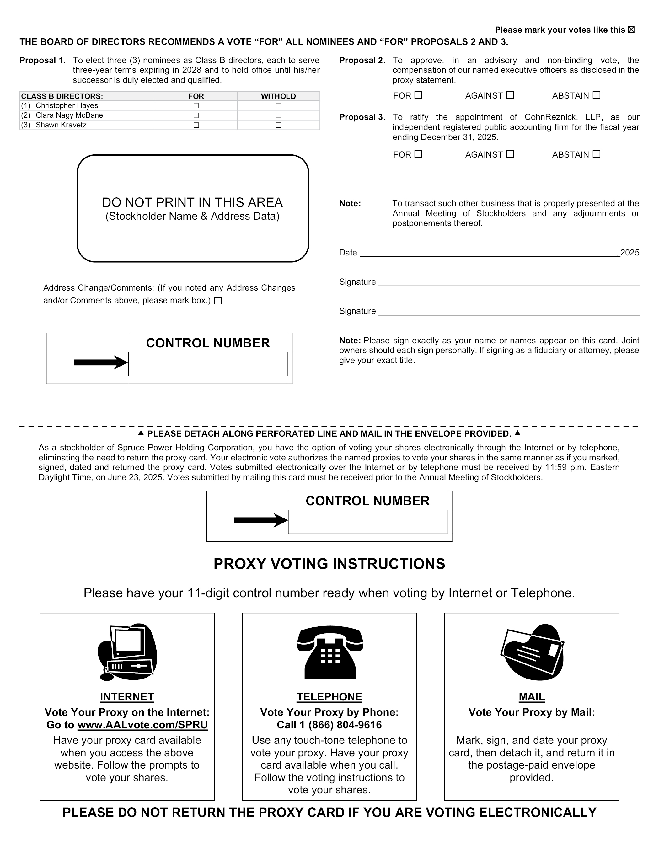 THE BOARD OF DIRECTORS RECOMMENDS A VOTE “FOR” ALL NOMINEES AND “FOR” PROPOSALS 2 AND 3. Proposal 1. To elect three (3) nominees as Class B directors, each to serve three-year terms expiring in 2028 and to hold office until his/her successor is duly elected and qualified. Please mark your votes like this CLASS B DIRECTORS: (1) Christopher Hayes (3) Shawn Kravetz FOR WITHOLD Proposal 2. To approve, in an advisory and non-binding vote, the compensation of our named executive officers as disclosed in the proxy statement. AGAINST ABSTAIN Proposal 3. To ratify the appointment of CohnReznick, LLP, as our independent registered public accounting firm for the fiscal year ending December 31, 2025. Note: To transact such other business that is properly presented at the Annual Meeting of Stockholders and any adjournments or postponements thereof. DO NOT PRINT IN THIS AREA (Stockholder Name & Address Data) Address Change/Comments: (If you noted any Address Changes and/or Comments above, please mark box.) Date , 2025 Signature Signature Note: Please sign exactly as your name or names appear on this card. Joint owners should each sign personally. If signing as a fiduciary or attorney, please give your exact title. CONTROL NUMBER PLEASE DETACH ALONG PERFORATED LINE AND MAIL IN THE ENVELOPE PROVIDED. As a stockholder of Spruce Power Holding Corporation, you have the option of voting your shares electronically through the Internet or by telephone, eliminating the need to return the proxy card. Your electronic vote authorizes the named proxies to vote your shares in the same manner as if you marked, signed, dated and returned the proxy card. Votes submitted electronically over the Internet or by telephone must be received by 11:59 p.m. Eastern Daylight Time, on June 23, 2025. Votes submitted by mailing this card must be received prior to the Annual Meeting of Stockholders. PROXY VOTING INSTRUCTIONS Please have your 11-digit control number ready when voting by Internet or Telephone. INTERNET Vote Your Proxy on the Internet: Go to www.AALvote.com/SPRU Have your proxy card available when you access the above website. Follow the prompts to vote your shares. TELEPHONE Vote Your Proxy by Phone: Call 1 (866) 804-9616 Use any touch-tone telephone to vote your proxy. Have your proxy card available when you call. Follow the voting instructions to vote your shares. MAIL Vote Your Proxy by Mail: card, then detach it, and return it in the postage-paid envelope provided. Mark, sign, and date your proxy PLEASE DO NOT RETURN THE PROXY CARD IF YOU ARE VOTING ELECTRONICALLY