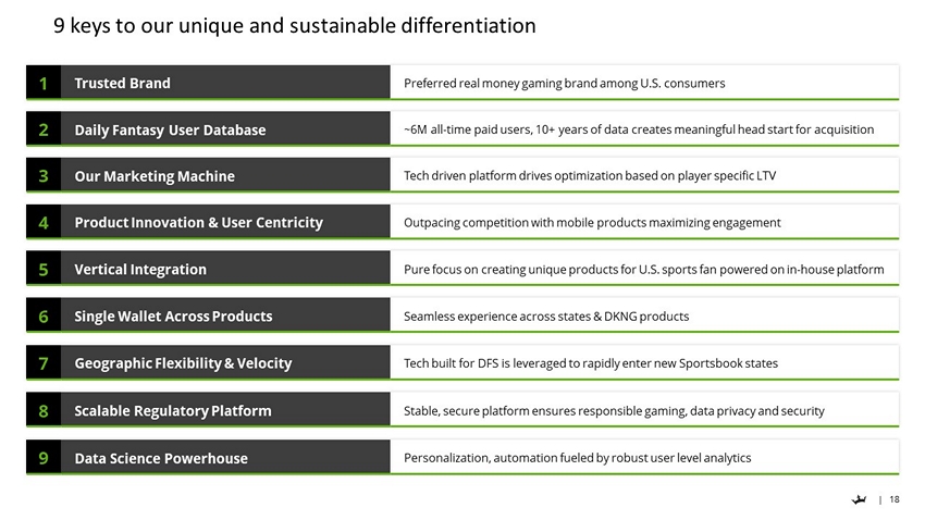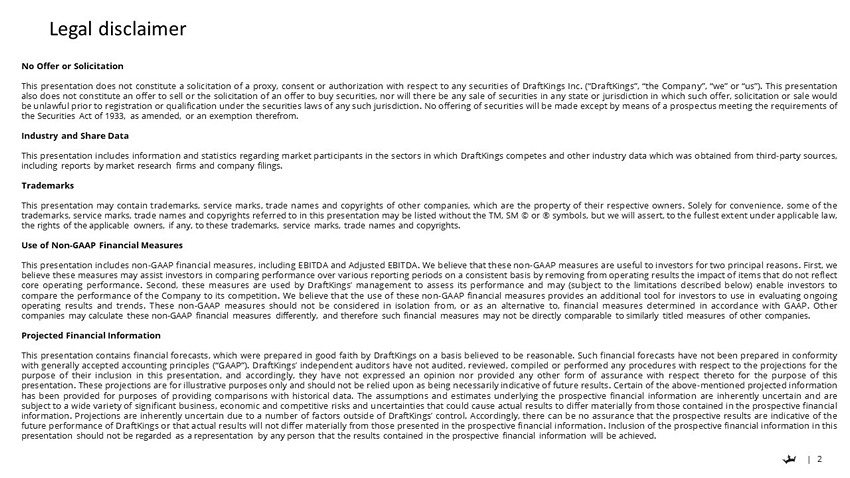 | 2 Legal disclaimer No Offer or Solicitation This presentation does not constitute a solicitation of a proxy, consent or authorization with respect to any securities of DraftKings Inc . (“DraftKings”, “the Company”, “we” or “us”) . This presentation also does not constitute an offer to sell or the solicitation of an offer to buy securities, nor will there be any sale of securities in any state or jurisdiction in which such offer, solicitation or sale would be unlawful prior to registration or qualification under the securities laws of any such jurisdiction . No offering of securities will be made except by means of a prospectus meeting the requirements of the Securities Act of 1933 , as amended, or an exemption therefrom . Industry and Share Data This presentation includes information and statistics regarding market participants in the sectors in which DraftKings competes and other industry data which was obtained from third - party sources, including reports by market research firms and company filings . Trademarks This presentation may contain trademarks, service marks, trade names and copyrights of other companies, which are the property of their respective owners . Solely for convenience, some of the trademarks, service marks, trade names and copyrights referred to in this presentation may be listed without the TM, SM © or ® symbols, but we will assert, to the fullest extent under applicable law, the rights of the applicable owners, if any, to these trademarks, service marks, trade names and copyrights . Use of Non - GAAP Financial Measures This presentation includes non - GAAP financial measures, including EBITDA and Adjusted EBITDA . We believe that these non - GAAP measures are useful to investors for two principal reasons . First, we believe these measures may assist investors in comparing performance over various reporting periods on a consistent basis by removing from operating results the impact of items that do not reflect core operating performance . Second, these measures are used by DraftKings’ management to assess its performance and may (subject to the limitations described below) enable investors to compare the performance of the Company to its competition . We believe that the use of these non - GAAP financial measures provides an additional tool for investors to use in evaluating ongoing operating results and trends . These non - GAAP measures should not be considered in isolation from, or as an alternative to, financial measures determined in accordance with GAAP . Other companies may calculate these non - GAAP financial measures differently, and therefore such financial measures may not be directly comparable to similarly titled measures of other companies . Projected Financial Information This presentation contains financial forecasts, which were prepared in good faith by DraftKings on a basis believed to be reasonable . Such financial forecasts have not been prepared in conformity with generally accepted accounting principles (“GAAP”) . DraftKings’ independent auditors have not audited, reviewed, compiled or performed any procedures with respect to the projections for the purpose of their inclusion in this presentation, and accordingly, they have not expressed an opinion nor provided any other form of assurance with respect thereto for the purpose of this presentation . These projections are for illustrative purposes only and should not be relied upon as being necessarily indicative of future results . Certain of the above - mentioned projected information has been provided for purposes of providing comparisons with historical data . The assumptions and estimates underlying the prospective financial information are inherently uncertain and are subject to a wide variety of significant business, economic and competitive risks and uncertainties that could cause actual results to differ materially from those contained in the prospective financial information . Projections are inherently uncertain due to a number of factors outside of DraftKings’ control . Accordingly, there can be no assurance that the prospective results are indicative of the future performance of DraftKings or that actual results will not differ materially from those presented in the prospective financial information . Inclusion of the prospective financial information in this presentation should not be regarded as a representation by any person that the results contained in the prospective financial information will be achieved .