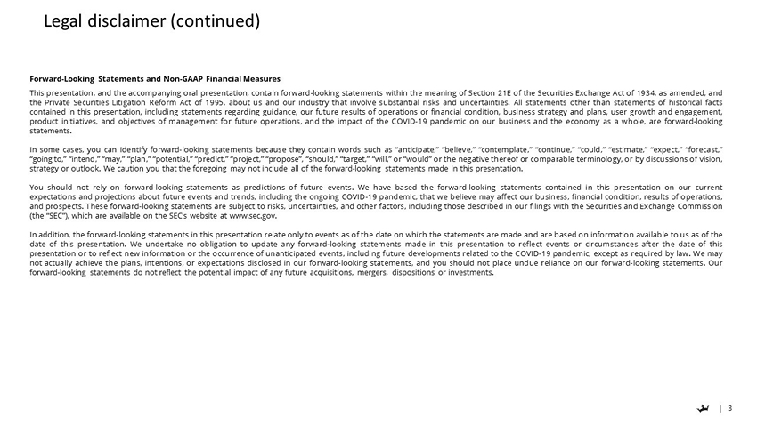 | 3 Legal disclaimer (continued) Forward - Looking Statements and Non - GAAP Financial Measures This presentation, and the accompanying oral presentation, contain forward - looking statements within the meaning of Section 21 E of the Securities Exchange Act of 1934 , as amended, and the Private Securities Litigation Reform Act of 1995 , about us and our industry that involve substantial risks and uncertainties . All statements other than statements of historical facts contained in this presentation, including statements regarding guidance, our future results of operations or financial condition, business strategy and plans, user growth and engagement, product initiatives, and objectives of management for future operations, and the impact of the COVID - 19 pandemic on our business and the economy as a whole, are forward - looking statements . In some cases, you can identify forward - looking statements because they contain words such as “anticipate,” “believe,” “contemplate,” “continue,” “could,” “estimate,” “expect,” “forecast,” “going to,” “intend,” “may,” “plan,” “potential,” “predict,” “project,” “propose”, “should,” “target,” “will,” or “would” or the negative thereof or comparable terminology, or by discussions of vision, strategy or outlook . We caution you that the foregoing may not include all of the forward - looking statements made in this presentation . You should not rely on forward - looking statements as predictions of future events . We have based the forward - looking statements contained in this presentation on our current expectations and projections about future events and trends, including the ongoing COVID - 19 pandemic, that we believe may affect our business, financial condition, results of operations, and prospects . These forward - looking statements are subject to risks, uncertainties, and other factors, including those described in our filings with the Securities and Exchange Commission (the “SEC”), which are available on the SEC’s website at www . sec . gov . In addition, the forward - looking statements in this presentation relate only to events as of the date on which the statements are made and are based on information available to us as of the date of this presentation . We undertake no obligation to update any forward - looking statements made in this presentation to reflect events or circumstances after the date of this presentation or to reflect new information or the occurrence of unanticipated events, including future developments related to the COVID - 19 pandemic, except as required by law . We may not actually achieve the plans, intentions, or expectations disclosed in our forward - looking statements, and you should not place undue reliance on our forward - looking statements . Our forward - looking statements do not reflect the potential impact of any future acquisitions, mergers, dispositions or investments .