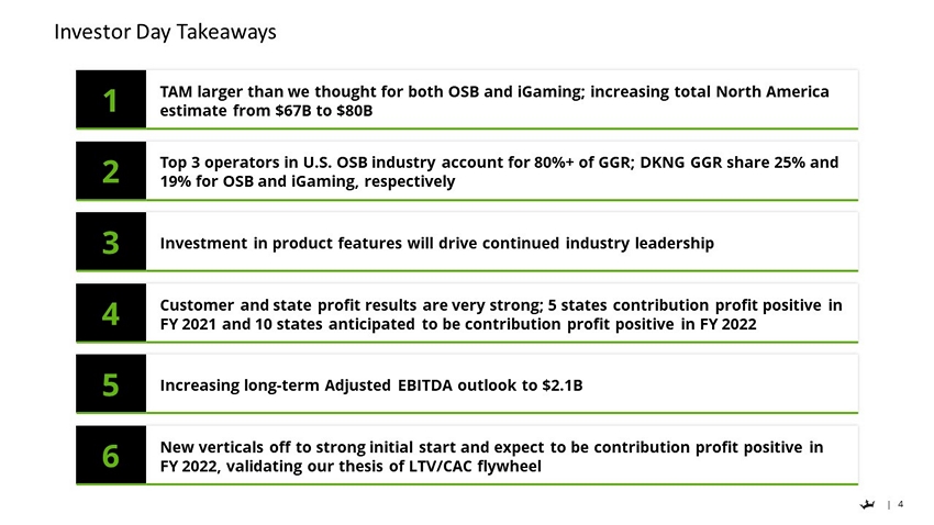 | 4 Investor Day Takeaways TAM larger than we thought for both OSB and iGaming; increasing total North America estimate from $67B to $80B 1 Top 3 operators in U.S. OSB industry account for 80%+ of GGR; DKNG GGR share 25% and 19% for OSB and iGaming, respectively 2 Investment in product features will drive continued industry leadership 3 Customer and state profit results are very strong; 5 states contribution profit positive in FY 2021 and 10 states anticipated to be contribution profit positive in FY 2022 4 Increasing long - term Adjusted EBITDA outlook to $2.1B 5 New verticals off to strong initial start and expect to be contribution profit positive in FY 2022, validating our thesis of LTV/CAC flywheel 6