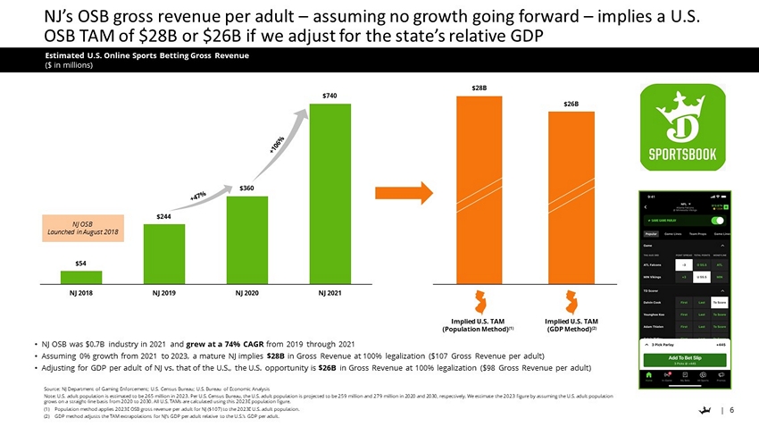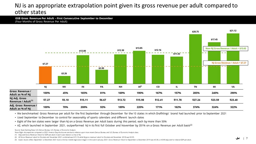 | 6 $28B $26B $54 $244 $360 $740 NJ 2018 NJ 2019 NJ 2020 NJ 2021 NJ’s OSB gross revenue per adult – assuming no growth going forward – implies a U.S. OSB TAM of $28B or $26B if we adjust for the state’s relative GDP Source: NJ Department of Gaming Enforcement; U.S. Census Bureau; U.S. Bureau of Economic Analysis Note: U.S. adult population is estimated to be 265 million in 2023. Per U.S. Census Bureau, the U.S. adult population is proj ect ed to be 259 million and 279 million in 2020 and 2030, respectively. We estimate the 2023 figure by assuming the U.S. adult p opu lation grows on a straight - line basis from 2020 to 2030. All U.S. TAMs are calculated using this 2023E population figure. (1) Population method applies 2023E OSB gross revenue per adult for NJ ($107) to the 2023E U.S. adult population. (2) GDP method adjusts the TAM extrapolations for NJ’s GDP per adult relative to the U.S.’s GDP per adult. Implied U.S. TAM (Population Method) (1) Implied U.S. TAM (GDP Method) (2) NJ OSB Launched in August 2018 • NJ OSB was $0.7B industry in 2021 and grew at a 74% CAGR from 2019 through 2021 • Assuming 0% growth from 2021 to 2023, a mature NJ implies $28B in Gross Revenue at 100% legalization ($107 Gross Revenue per adult) • Adjusting for GDP per adult of NJ vs. that of the U.S., the U.S. opportunity is $26B in Gross Revenue at 100% legalization ($98 Gross Revenue per adult) Estimated U.S. Online Sports Betting Gross Revenue ($ in millions)