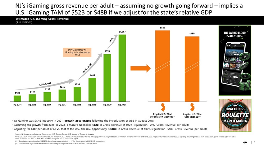 | 7 $7.27 $3.26 $12.00 $5.90 $12.30 $13.85 $12.16 $11.43 $20.75 $17.45 $21.12 NJ WV IN PA NH IA CO IL TN MI VA OSB Gross Revenue Per Adult – First Consecutive September to December (Four Months of Gross Revenue Per Adult) NJ is an appropriate extrapolation point given its gross revenue per adult compared to other states • We benchmarked Gross Revenue per adult for the first September through December for the 10 states in which DraftKings' brand had launched prior to September 2021 • Used September to December to control for seasonality of sports calendars and different launch dates • Eight of the ten states were larger than NJ on a Gross Revenue per Adult basis during this period, each by more than 50% • AZ, which launched in September 2021, outperformed NJ in its first full October and November by 351% on a Gross Revenue per A dul t basis (2) Source: State Gaming Data; U.S. Census Bureau; U.S. Bureau of Economic Analysis Note: Slight discrepancies compared to 2021 Investor Day disclosures are due to reliance upon more recent Census Bureau and U .S. Bureau of Economic Analysis data. (1) Adjusted Gross Revenue / Adult for GDP per adult in each state relative to that of NJ. (2) AZ Gross Revenue / adult for October and November 2021 combined was $15.13, while NJ gross revenue / adult for October and No vem ber 2018 was $3.35. (3) Iowa’s results reflect September to December 2021 due to the fact mobile registration began in the state in January 2021. Gro ss Revenue / Adult for September to December 2019 was $3.38, or $3.90 adjusted for relative GDP per adult. Non - NJ Gross Revenue / Adult = $13.02 NJ Gross Revenue / Adult = $7.27 Gross Revenue / Adult as % of NJ 100% 45% 165% 81% 169% 190% 167% 157% 285% 240% 290% NJ Adj. Gross Revenue / Adult (1) $7.27 $5.10 $15.11 $6.67 $13.72 $15.98 $12.41 $11.78 $27.24 $23.59 $23.40 Adj. Gross Revenue / Adult as % of NJ 100% 70% 208% 92% 189% 220% 171% 162% 374% 324% 322% (3)