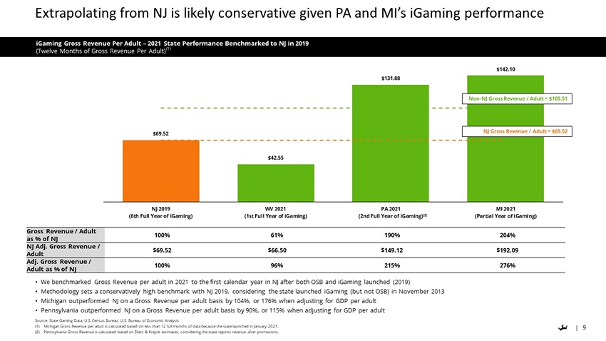 | 8 $52B $48B $123 $149 $197 $246 $299 $483 $970 $1,367 NJ 2014 NJ 2015 NJ 2016 NJ 2017 NJ 2018 NJ 2019 NJ 2020 NJ 2021 • NJ iGaming was $1.4B industry in 2021; growth accelerated following the introduction of OSB in August 2018 • Assuming 0% growth from 2021 to 2023, a mature NJ implies $52B in Gross Revenue at 100% legalization ($197 Gross Revenue per adult) • Adjusting for GDP per adult of NJ vs. that of the U.S., the U.S. opportunity is $48B in Gross Revenue at 100% legalization ($180 Gross Revenue per adult) Source: NJ Department of Gaming Enforcement; U.S. Census Bureau; U.S. Bureau of Economic Analysis Note: U.S. adult population is estimated to be 265 million in 2023. Per U.S. Census Bureau, the U.S. adult population is proj ect ed to be 259 million and 279 million in 2020 and 2030, respectively. We estimate the 2023 figure by assuming the U.S. adult p opu lation grows on a straight - line basis from 2020 to 2030. All U.S. TAMs are calculated using this 2023E population figure. (1) Population method applies NJ 2023E Gross Revenue per adult of $197 for iGaming to the 2023E U.S. population. (2) GDP method adjusts the TAM extrapolations for NJ’s GDP per adult relative to the U.S.’s GDP per adult. Implied U.S. TAM (Population Method) (1) Implied U.S. TAM (GDP Method) (2) DKNG launched NJ iGaming in late December 2018 NJ’s iGaming gross revenue per adult – assuming no growth going forward – implies a U.S. iGaming TAM of $52B or $48B if we adjust for the state’s relative GDP Estimated U.S. iGaming Gross Revenue ($ in millions)