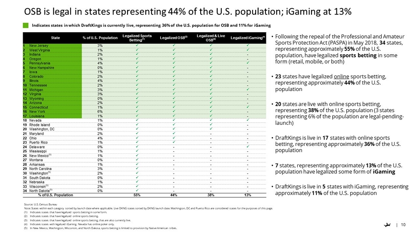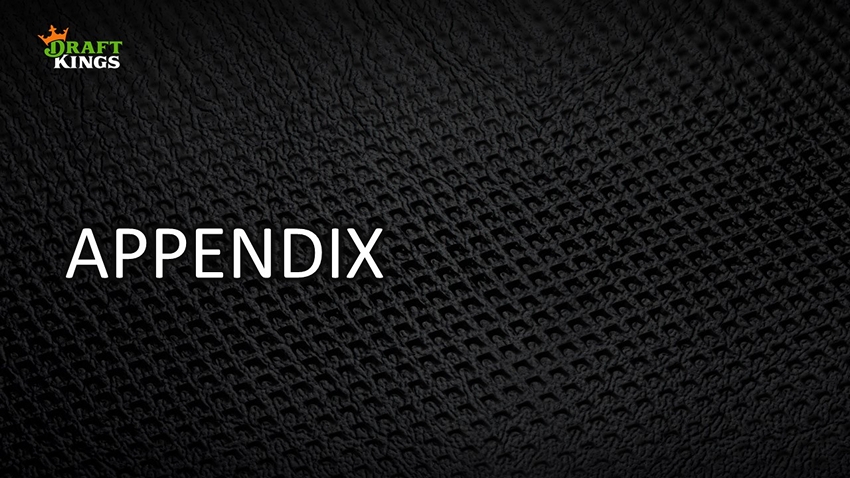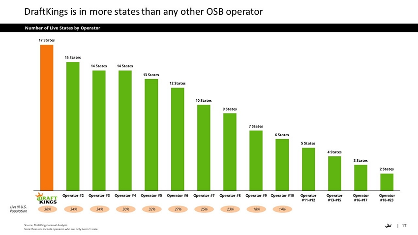 | 17 Number of Live States by Operator DraftKings is in more states than any other OSB operator Source: DraftKings Internal Analysis Note: Does not include operators who are only live in 1 state. 36% Live % U.S. Population 27% 34% 34% 30% 32% 25% 23% 18% 14% 17 States 15 States 14 States 14 States 13 States 12 States 10 States 9 States 7 States 6 States 5 States 4 States 3 States 2 States Operator #2 Operator #3 Operator #4 Operator #5 Operator #6 Operator #7 Operator #8 Operator #9 Operator #10 Operator #11-#12 Operator #13-#15 Operator #16-#17 Operator #18-#23