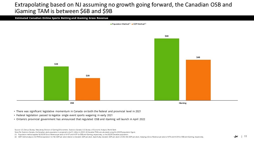 | 11 $3B $6B $2B $4B OSB iGaming Population Method GDP Method Estimated Canadian Online Sports Betting and iGaming Gross Revenue Source: U.S. Census Bureau; New Jersey Division of Gaming Enforcement; Statistics Canada; U.S. Bureau of Economic Analysis; W orl d Bank Note: Per Statistics Canada, the Canadian adult population is projected to be 31 million in 2023. All Canadian TAMs are calcu lat ed using this 2023E population figure. (1) Population method applies NJ 2023E Gross Revenue per adult of $107 and $197 for OSB and iGaming, respectively, to the 2023E C ana dian population. (2) GDP method adjusts the TAM extrapolation for NJ’s GDP per adult relative to Canada’s GDP per adult. Specifically, Canada’s GD P p er adult is 0.66x NJ’s GDP per adult, implying a Gross Revenue per adult of $70 and $129 for OSB and iGaming, respectively. • There was significant legislative momentum in Canada on both the federal and provincial level in 2021 • Federal legislation passed to legalize single event sports wagering in early 2021 • Ontario’s provincial government has announced that regulated OSB and iGaming will launch in April 2022 Extrapolating based on NJ assuming no growth going forward, the Canadian OSB and iGaming TAM is between $6B and $9B (1) (2)