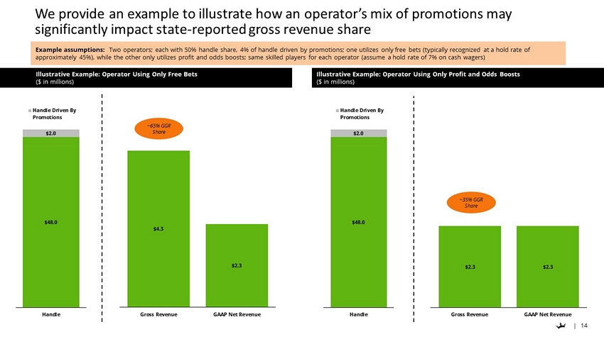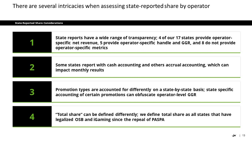 | 13 There are several intricacies when assessing state - reported share by operator State Reported Share Considerations State reports have a wide range of transparency; 4 of our 17 states provide operator - specific net revenue, 5 provide operator - specific handle and GGR, and 8 do not provide operator - specific metrics 1 Some states report with cash accounting and others accrual accounting, which can impact monthly results 2 Promotion types are accounted for differently on a state - by - state basis; state specific accounting of certain promotions can obfuscate operator - level GGR 3 “Total share” can be defined differently; we define total share as all states that have legalized OSB and iGaming since the repeal of PASPA 4