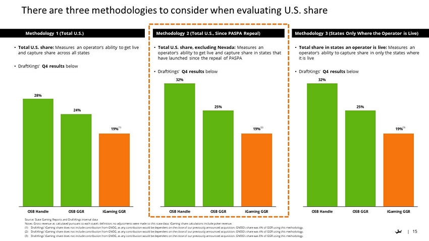 | 14 $2.3 $2.3 Gross Revenue GAAP Net Revenue $4.3 $2.3 Gross Revenue GAAP Net Revenue Illustrative Example: Operator Using Only Profit and Odds Boosts ($ in millions) ~65% GGR Share We provide an example to illustrate how an operator’s mix of promotions may significantly impact state - reported gross revenue share ~35% GGR Share Illustrative Example: Operator Using Only Free Bets ($ in millions) Example assumptions: Two operators; each with 50% handle share, 4% of handle driven by promotions; one utilizes only free bets (typically recogniz ed at a hold rate of approximately 45%), while the other only utilizes profit and odds boosts; same skilled players for each operator (assume a ho ld rate of 7% on cash wagers) $48.0 $2.0 Handle Handle Driven By Promotions $48.0 $2.0 Handle Handle Driven By Promotions