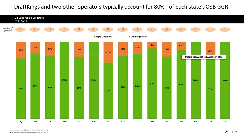 | 15 Methodology 1 (Total U.S.) There are three methodologies to consider when evaluating U.S. share • Total U.S. share: Measures an operator’s ability to get live and capture share across all states • DraftKings’ Q4 results below • Total U.S. share, excluding Nevada: Measures an operator’s ability to get live and capture share in states that have launched since the repeal of PASPA • DraftKings’ Q4 results below • Total share in states an operator is live: Measures an operator’s ability to capture share in only the states where it is live • DraftKings’ Q4 results below Methodology 2 (Total U.S., Since PASPA Repeal) Methodology 3 (States Only Where the Operator is Live) Source: State Gaming Reports and DraftKings internal data Notes: Gross revenue as calculated pursuant to each state’s definition; no adjustments were made to this state data; iGaming sha re calculations include poker revenue. (1) DraftKings’ iGaming share does not include contribution from GNOG, as any contribution would be dependent on the close of our pr eviously announced acquisition. GNOG’s share was 4% of GGR using this methodology. (2) DraftKings’ iGaming share does not include contribution from GNOG, as any contribution would be dependent on the close of our pr eviously announced acquisition. GNOG’s share was 4% of GGR using this methodology. (3) DraftKings’ iGaming share does not include contribution from GNOG, as any contribution would be dependent on the close of our pr eviously announced acquisition. GNOG’s share was 6% of GGR using this methodology. 28% 24% 19% OSB Handle OSB GGR iGaming GGR 32% 25% 19% OSB Handle OSB GGR iGaming GGR 32% 25% 19% OSB Handle OSB GGR iGaming GGR (1) (2) (3)