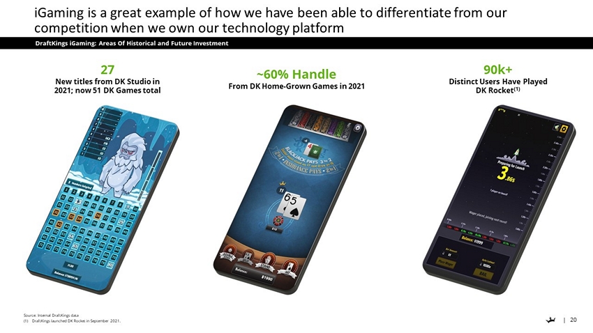| 20 iGaming is a great example of how we have been able to differentiate from our competition when we own our technology platform DraftKings iGaming: Areas Of Historical and Future Investment Source: Internal DraftKings data (1) DraftKings launched DK Rocket in September 2021. 27 New titles from DK Studio in 2021; now 51 DK Games total ~60% Handle From DK Home - Grown Games in 2021 90k+ Distinct Users Have Played DK Rocket (1)