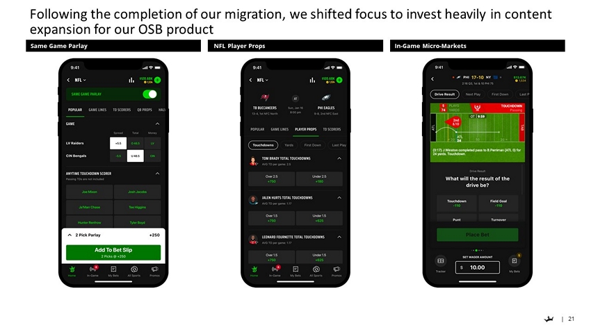 | 21 Following the completion of our migration, we shifted focus to invest heavily in content expansion for our OSB product Same Game Parlay NFL Player Props In - Game Micro - Markets