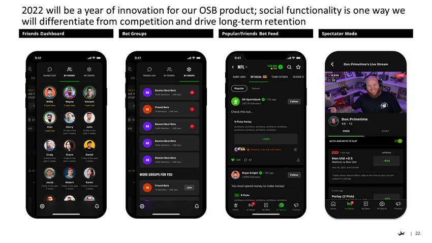 | 22 2022 will be a year of innovation for our OSB product; social functionality is one way we will differentiate from competition and drive long - term retention Friends Dashboard Spectator Mode Bet Groups Popular/Friends Bet Feed