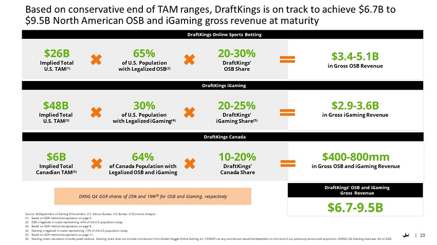 | 23 Based on conservative end of TAM ranges, DraftKings is on track to achieve $6.7B to $9.5B North American OSB and iGaming gross revenue at maturity Source: NJ Department of Gaming Enforcement; U.S. Census Bureau; U.S. Bureau of Economic Analysis (1) Based on GDP method extrapolation on page 6. (2) OSB is legalized in states representing 44% of the U.S. population today. (3) Based on GDP method extrapolation on page 8. (4) iGaming is legalized in states representing 13% of the U.S. population today. (5) Based on GDP method extrapolation on page 11. (6) iGaming share calculation includes poker revenue. iGaming share does not include contribution from Golden Nugget Online Gamin g, Inc. (“GNOG”) as any contribution would be dependent on the close of our previously announced acquisition. GNOG’s Q4 iGaming sha re was 4% of GGR. $6.7 - 9.5B $26B Implied Total U.S. TAM (1) 65% of U.S. Population with Legalized OSB (2) 20 - 30% DraftKings’ OSB Share $3.4 - 5.1B in Gross OSB Revenue $48B Implied Total U.S. TAM (3) 30% of U.S. Population with Legalized iGaming (4) 20 - 25% DraftKings’ iGaming Share (5) $2.9 - 3.6B in Gross iGaming Revenue DraftKings’ OSB and iGaming Gross Revenue DraftKings iGaming DraftKings Online Sports Betting DKNG Q4 GGR shares of 25% and 19% (6) for OSB and iGaming, respectively $6B Implied Total Canadian TAM (5) 64% of Canada Population with Legalized OSB and iGaming 10 - 20% DraftKings’ Canada Share $400 - 800mm in Gross OSB and iGaming Revenue DraftKings Canada