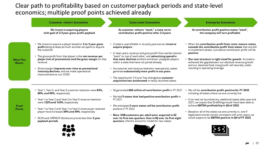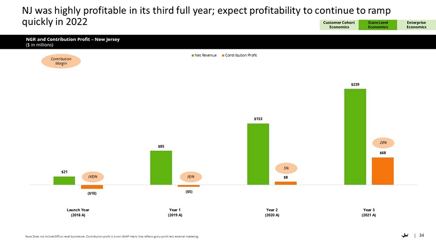 | 33 The result of strong payback periods is that states turn positive after two to three years DKNG State Launch and Profitability by State Customer Cohort Economics State Level Economics Enterprise Economics State 2018 2019 2020 2021 2022E % Pop NJ Q3 2018 Launch Profitable 2.7 % WV Q3 2019 Launch Profitable 0.5 % IN Q4 2019 Launch Profitable 2.1 % PA Q4 2019 Launch Expected Profitable 3.9 % NH Q4 2019 Launch Profitable 0.4 % IA Q1 2020 Launch Expected Profitable 1.0 % CO Q2 2020 Launch Expected Profitable 1.8 % IL Q3 2020 Launch Profitable 3.9 % TN Q4 2020 Launch 2.1 % MI Q1 2021 Launch 3.0 % VA Q1 2021 Launch 2.6 % WY Q3 2021 Launch 0.2 % AZ Q3 2021 Launch 2.2 % CT Q4 2021 Launch Expected Profitable 1.1 % NY Q1 2022 Launch 5.9 % LA Q1 2022 Launch 1.4 % OR Q1 2022 Launch Expected Profitable 1.3 % Note: Does not include DFS or retail businesses. “Profitable” relates to contribution profit, which is a non - GAAP metric defined as gross profit less external marketing.